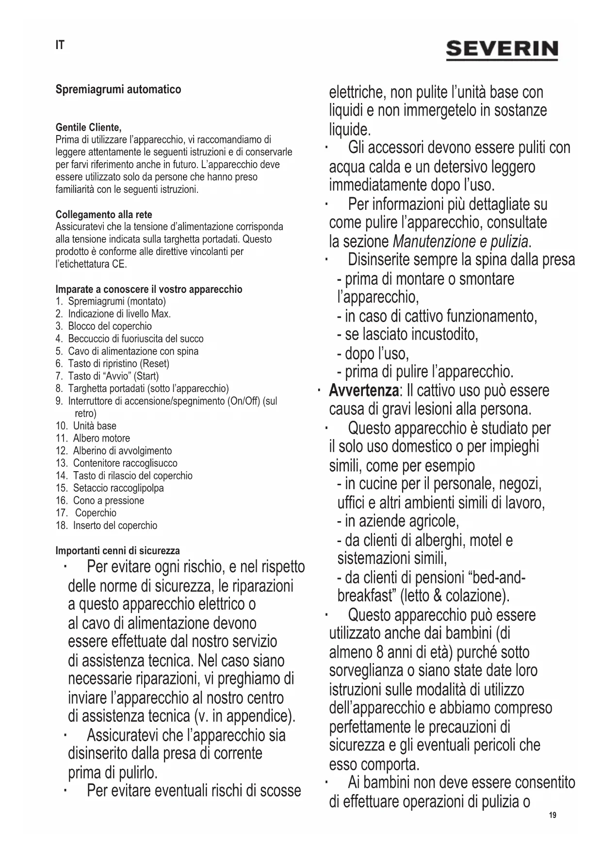 Scarica le istruzioni per il tuo Centrifuga in formato PDF gratuitamente! Trova il tuo manuale CP 3537 - SEVERIN e riprendi in mano il tuo dispositivo elettronico. In questa pagina sono pubblicati tutti i documenti necessari per l'utilizzo del tuo dispositivo. CP 3537 del marchio SEVERIN.
