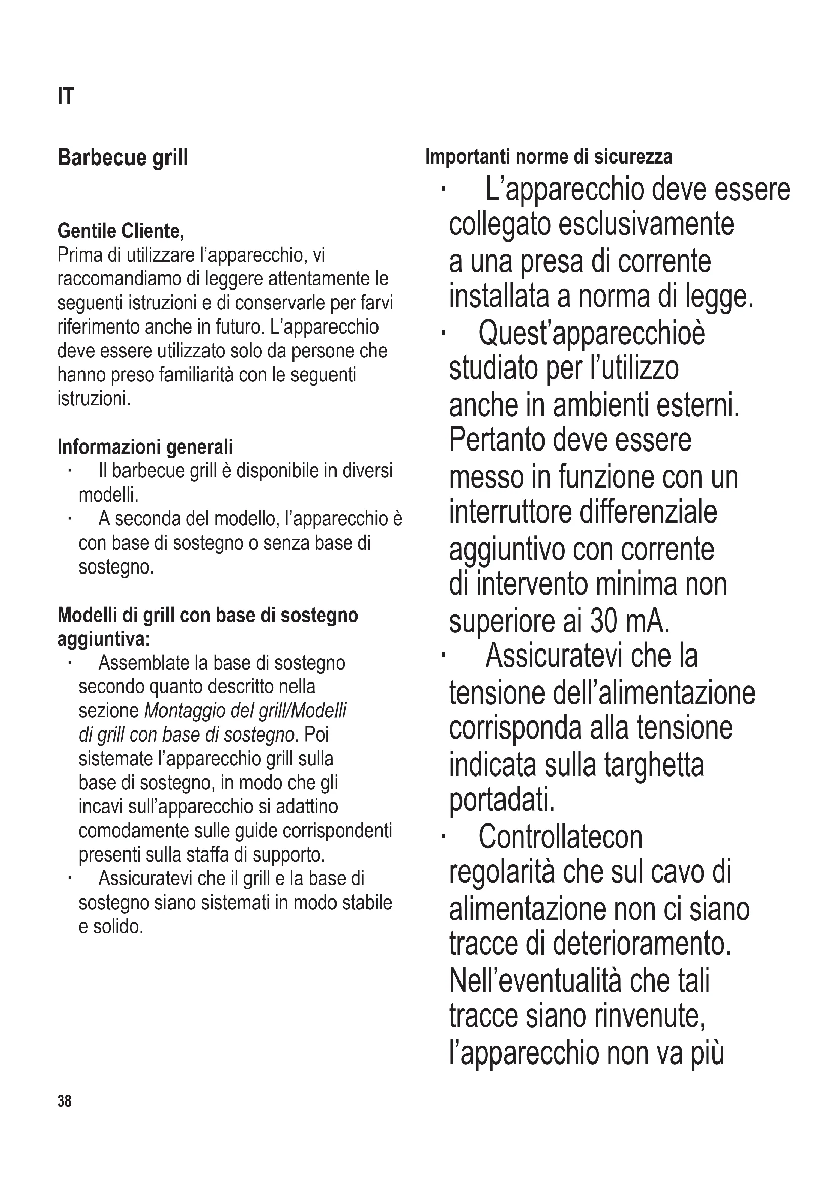 saldi e sicuri. Primo riscaldamento ∙ Inserite la spina in una presa di corrente adatta con messa a terra. ∙ Lasciate che il grill si riscaldi per almeno 10 minuti, impostato sulla potenza massima e senza inserire alimenti. Ciò eliminerà l’odore caratteristico esalato al momento della prima messa in funzione degli apparecchi elettrici. È possibile che sia emesso un po’ di fumo; questo fenomeno è abbastanza normale, ma assicurate che ci sia un’adeguata ventilazione nel locale aprendo nestre o balconi. ∙ Pulite la piastra del grill così come descritto nella sezione Manutenzione e pulizia. Modalità d’uso ∙ Il barbecue grill va utilizzato esclusivamente su una supercie piana termoresistente, che sia anche impermeabile agli schizzi e alle macchie, dato che non sempre è possibile evitare schizzi durante la cottura di cibi ad alto contenuto di grassi o d’acqua. ∙ Modelli grill con base di sostegno: controllate che il grill e la sua base di sostegno siano messi in una posizione stabile e sicura. ∙ Controllate che il barbecue grill sia stato montato correttamente. ∙ Inserite la spina in una presa di corrente adatta con messa a terra. ∙ Fate scorrere il termostato sulla posizione MAX. La spia luminosa si accende e la piastra del grill si riscalda. ∙ Lasciate che il grill si riscaldi per circa 10 minuti prima di inserire un qualsiasi alimento. ∙ È possibile regolare la temperatura in base alle esigenze, aumentandola o diminuendola, agendo sulla manopola di comando della temperatura. ∙ Controllate regolarmente e, se necessario, svuotate la vaschetta raccogligocce dai grassi che vi scorrono dentro. ∙ Alla ne del processo di cottura: ∙ Fate scorrere il termostato sulla posizione MIN.44 104 x 142 mm ∙ Scollegate la spina dalla presa di corrente. ∙ Fate raffreddare completamente il barbecue grill. Manutenzione e pulizia ∙ Dopo l’uso assicuratevi che il grill sia perfettamente pulito. ∙ Prima di procedere alla pulizia del grill, scollegatelo dall’alimentazione elettrica e aspettate che l’apparecchio si sia raffreddato completamente. ∙ Non utilizzate pagliette metalliche, di acciaio o prodotti detergenti abrasivi. ∙ Stronate la piastra del grill con della carta da cucina. Per eliminare residui persistenti di alimenti, potete rimuovere la piastra e lavarla con acqua e detersivo per i piatti usando una spugna morbida – potete anche lasciarla in ammollo per un po’. La piastra del grill deve essere asciugata perfettamente. ∙ Per evitare rischi di scosse elettriche, l’apparecchio grill con l’elemento riscaldante e il cavo di alimentazione non devono essere puliti né immersi in liquidi. L’apparecchio grill può essere pulito con un panno non lanuginoso leggermente umido. Asciugate accuratamente con un panno morbido. ∙ La vaschetta raccogligocce può essere lavata con acqua e detersivo per i piatti, o anche in lavastoviglie. ∙ I vari elementi singoli non sono lavabili in lavastoviglie. Smaltimento Gli apparecchi contrassegnati con questo simbolo devono essere smaltiti separatamente dai normali riuti domestici perché contengono materiali di valore che possono essere riciclati. Lo smaltimento adeguato protegge l’ambiente e la salute umana. Le autorità locali o il negoziante di riferimento possono fornire ulteriori informazioni in materia. Dichiarazione di garanzia La garanzia sui nostri prodotti ha validità di 2 anni dalla data di vendita (certicata da scontrino scale) e comprende gli eventuali difetti del materiale o di particolari di costruzione. I danni derivanti da un uso improprio, rotture da caduta o similari non vengono riconosciuti. La presente garanzia non pregiudica i vostri diritti legali, né i diritti acquisiti in quanto consumatore e riconosciuti dalla legislazione nazionale vigente che disciplina l‘acquisto di beni. La garanzia decade nel momento in cui gli apparecchi vengono aperti o manomessi da Centri non da noi autorizzati.104 x 142 mm