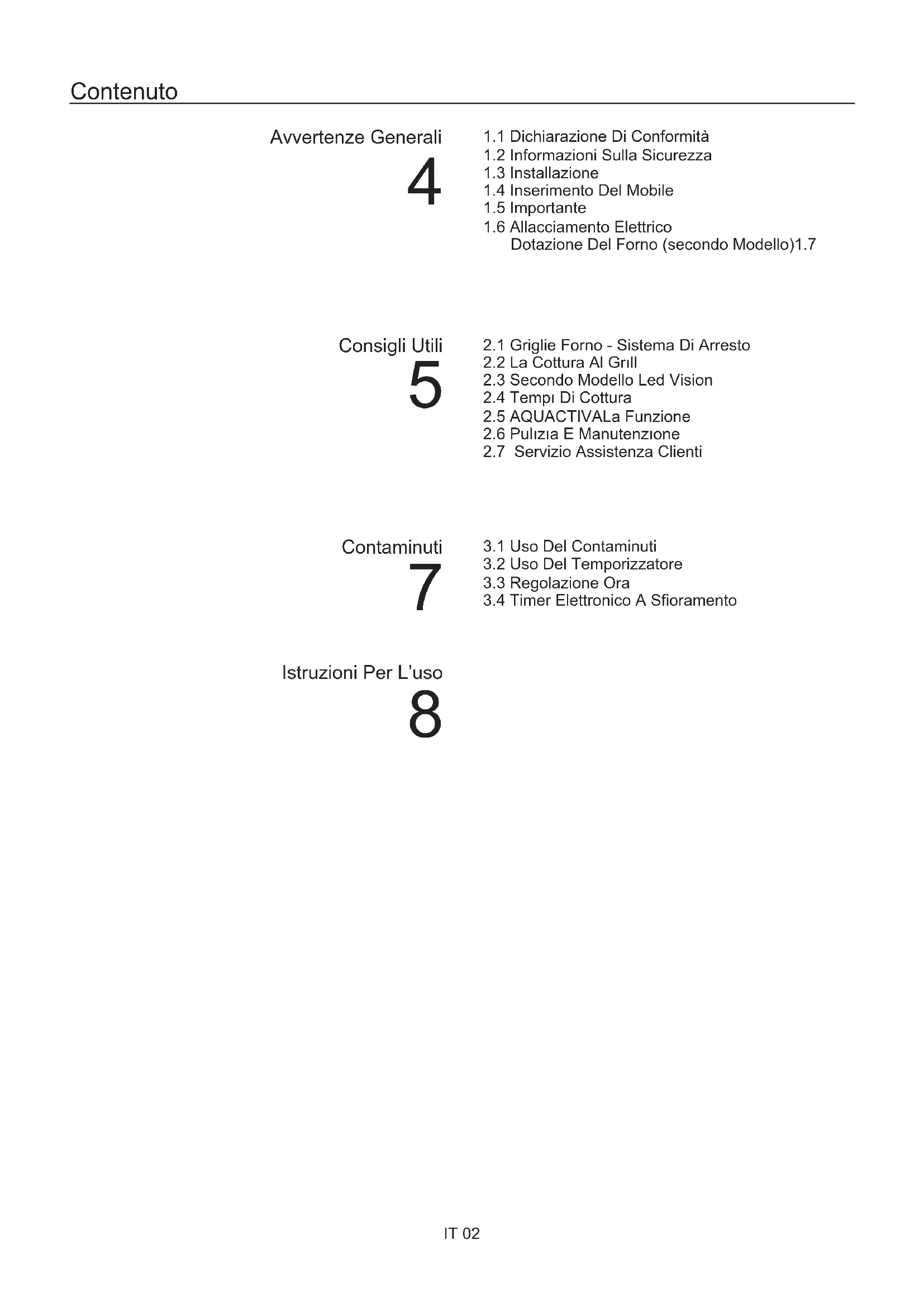 Per la pulizia dei vetri della porta del forno non utilizzare materiali abrasivi raschietti o oggetti che possono graffiare la superficie del vetro. Pulire le superfici in acciaio inox e smaltate con acqua tiepida e sapone, oppure con appositi prodotti in commercio, evitando assolutamente l’uso di polveri abrasive che danneggerebbero le superfici e le parti estetiche. La pulizia del forno è molto importante e deve essere effettuata ogni volta che questo viene usato. Infatti, sulle pareti si depositano grassi sciolti durante la cottura che potrebbero, alla successiva accensione, produrre odori sgradevoli che nuocerebbero al buon esito della cottura. Per la pulizia usare acqua calda e detersivo, sciacquando accuratamente. Per eliminare questo fastidioso intervento, su tutti i modelli possono essere inseriti pannelli autopulenti, offerti come accessori opzionali: vedere apposito paragrafo«FORNOAUTOPULENTE CATALITICO » Usare detersivi e pagliette d’acciaio per le griglie inox. La pulizia delle superfici in cristallo temperato deve essere eseguita quando le superfici sono fredde. Eventuali rotture dovute alla non osservanza di questa regola elementare non rientrano nei termini di garanzia. La lampada forno può essere sostituita disinserendo elettricamente l’apparecchio e svitando l’ampolla che la racchiude, sostituendo la lampada non funzionante con una analoga resistente alle alte temperature. MATRICOLA DEL PRODOTTO. Dove si trova? E’ indispensabile che comunichi al Servizio Assistenza Tecnica Autorizzato la sigla del prodotto ed il numero di matricola (16 caratteri che iniziano con la cifra 3) che troverà sul certificato di garanzia oppure sulla targa matricola del prodotto (figura in ultima pagina). In questo modo Lei potrà contribuire ad evitare trasferte inutili del tecnico, risparmiando oltretutto i relativi costi. IT 06Per selezionare il tempo prescelto, ruotarela manopola di un giro completo, quindiritornare con l’indice nella posizionecorrispondente al tempo desiderato. Alloscadere del tempo, entrerà in azione lasuoneria per alcuni secondi.Con questo meccanismo è possibileprogrammare la durata espressa in minutidella cottura e quindi lo spegnimentoautomatico del forno al termine del tempodesiderato (max. 120 minuti).Allo scadere del tempo prescelto, lamanopola raggiungerà la posizione disuoneria O in corrispondenza della qua le i lforno s i spegne automaticamente.Il forno può essere acceso solo impostando un tempo di cotturao girando la manopola inposizione .