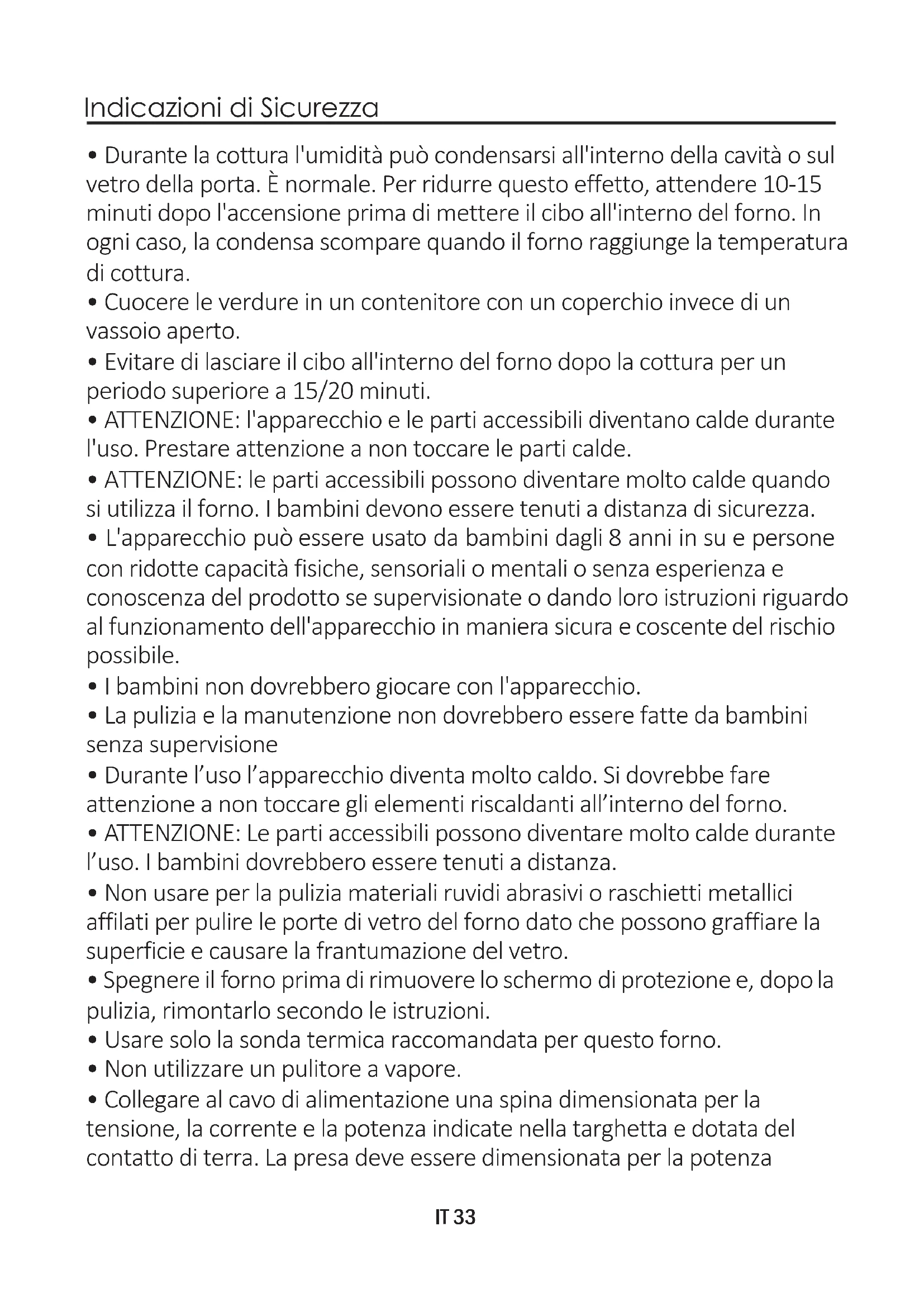 Utilizzare il forno solo per lo scopo per cui è stato progettato, ossia solo per la cottura di alimenti; qualsiasi altro utilizzo, ad esempio come fonte di riscaldamento, è considerato improprio e quindi pericoloso. Il costruttore non può essere considerato responsabile per eventuali danni derivanti da usi impropri,erronei ed irragionevoli. L’usodi un qualsiasi apparecchio elettricocomportal’osservanza di alcune regole fondamentali: - non tirareil cavodi alimentazioneper staccarela spina della presa di corrente; - non toccarel’apparecchiocon mani o piedi bagnati o umidi; - in generale è sconsigliabile l’usodi adattatori,presemultiple e prolunghe; - in caso di guastoe/o cattivofunzionamentodell’apparecchio, spegnerlo e non manometterlo.