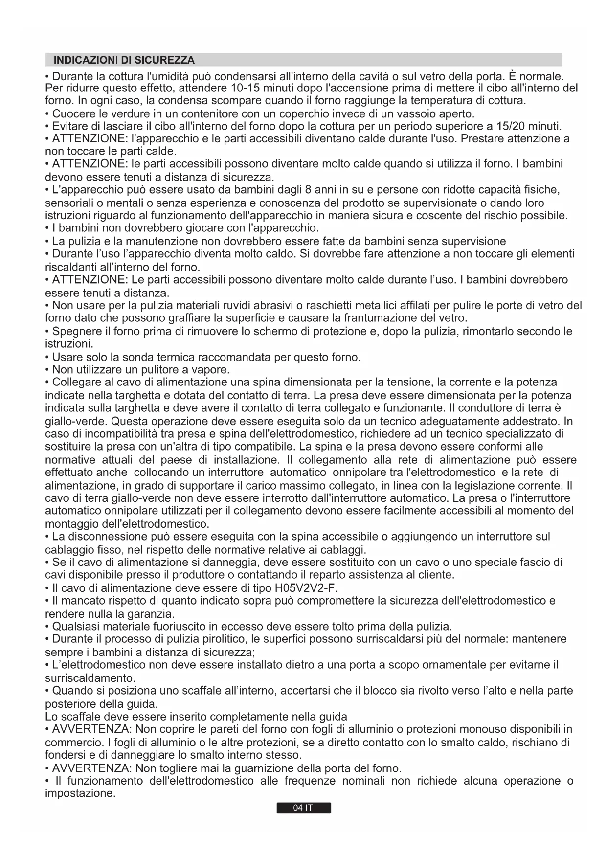 - Il cavo di alimentazione deve essere di tipo H05V2V2-F.