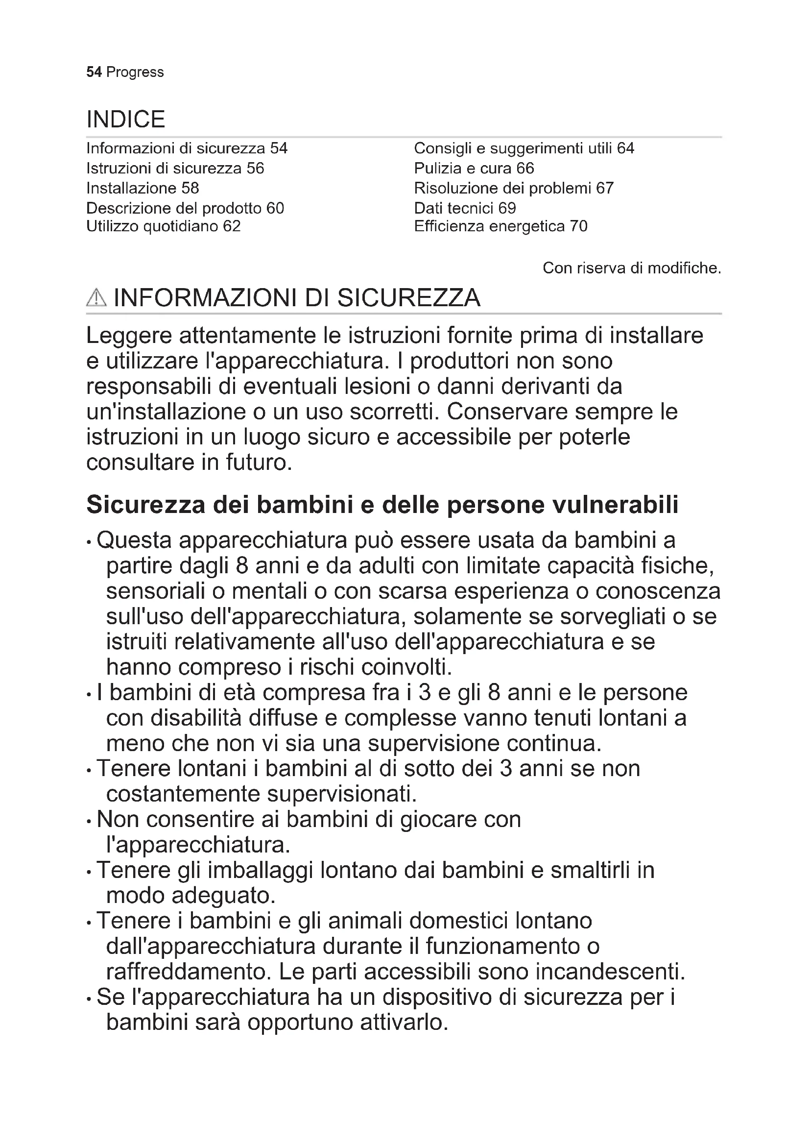 - Se l'apparecchiatura ha un dispositivo di sicurezza per i bambini sarà opportuno attivarlo. 54 Progress• I bambini non devono eseguire interventi di pulizia e manutenzione sull'apparecchiatura senza essere supervisionati. Avvertenze di sicurezza generali