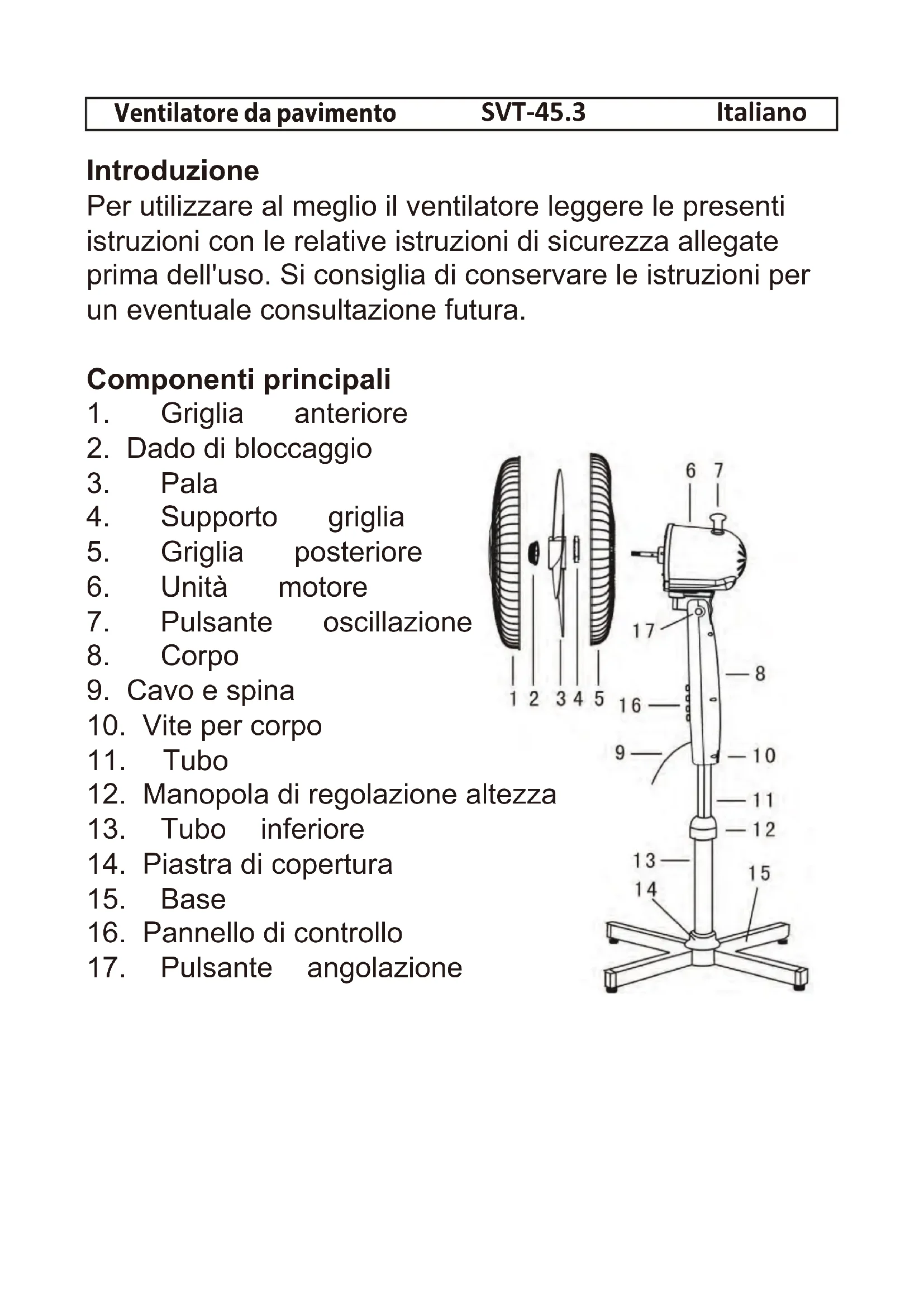 ventilatore dalla polvere. Si consiglia di conservare il ventilatore nella confezione originaria. Assemblaggio ?\_}{x_}`x" piastra di copertura (14). ?\_}}x_}{x"% (8) al tubo (11) e bloccarlo tramite la vite (10). Impostare il ventilatore all'altezza corretta e serrare la manopola di regolazione dell'altezza. - Spingere la griglia posteriore (5) verso il motore e fissarla tramite l'apposito supporto (4). ?#%%_{x"% dado di bloccaggio (2). - Incastrare la griglia anteriore (1) sulla griglia posteriore (5) e fissarle insieme. Utilizzo - Inclinare l'unità motore all'angolazione richiesta tramite il pulsante di angolazione (17). - Collegare il ventilatore. - Accendere il ventilatore da pavimento premendo i pulsanti sul pannello di controllo. - Attivare o disattivare la funzione di rotazione tramite il pulsante di oscillazione (7) in cima all'unità motore.Smaltimento di apparecchiature e batterie Il simbolo sopra e sul prodotto indica che è classificato come apparecchiatura elettrica ed elettronica e non deve essere smaltito con rifiuti domestici o commerciali al termine del suo ciclo di vita.