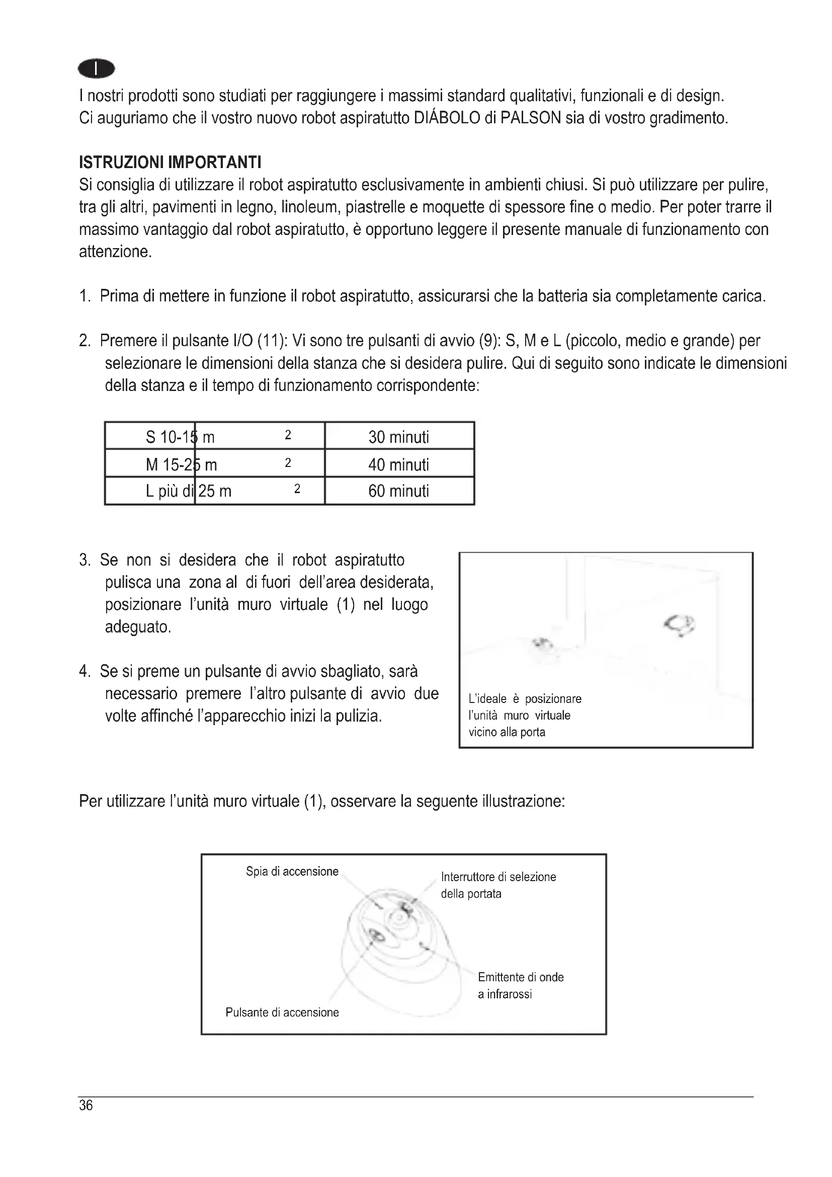Si consiglia di utilizzato il robot aspiratutto esclusivamente in ambienti chiusi. Si può utilizzato per pulire, tra gli altri, pavimenti in legno, linoleum, piastrelle e moquette di spessore fine o medio. Per poter trattre il massimovantaggio dal robot aspiratutto, è opportuno leggere il presente manuale di funzionamento con attenzione.