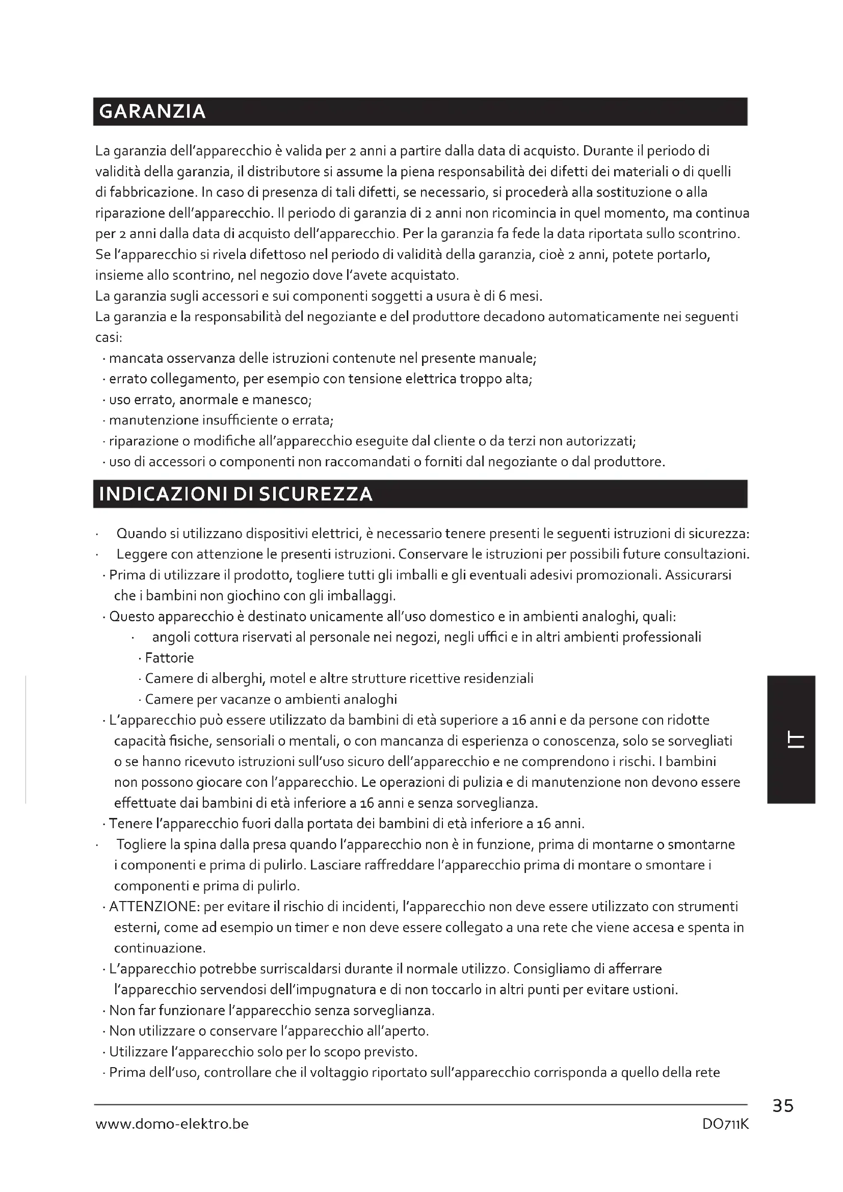 - L’apparecchio ora è decalcicato. MISURE AMBIENTALI Il simbolo sul prodotto o sulla confezione indica che esso non deve essere trattato come riuto domestico. Deve, al contrario, essere conferito al punto di raccolta predisposto per il riciclo delle apparecchiature elettriche ed elettroniche. Facendo in modo che questo prodotto venga smaltito correttamente aiuterete a prevenire potenziali conseguenze negative per l’ambiente e la salute dell’uomo, che potrebbero essere causate da uno smaltimento non corretto. Per maggiori informazioni sul riciclo di questo prodotto, consultare le autorità comunali, l’azienda o il servizio responsabili della raccolta dei riuti domestici o il negozio in cui il prodotto è stato acquistato. Il materiale di imballaggio è riciclabile. Lo smaltimento dell’imballaggio deve avvenire al ne di tutelare l’ambiente.41 DO711K www.domo-elektro.be