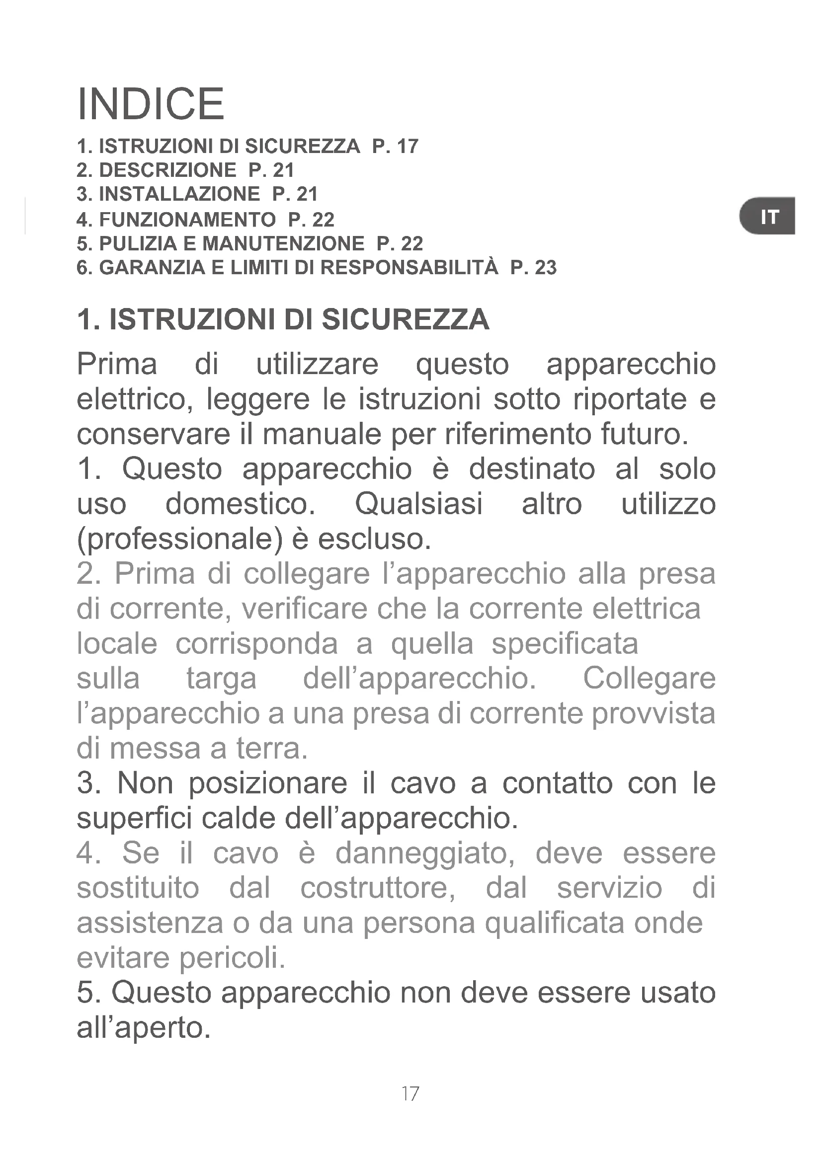Prima di utilizzare questo apparecchio elettrico, leggere le istruzioni sotto riportate e conservare il manuale per riferimento futuro.