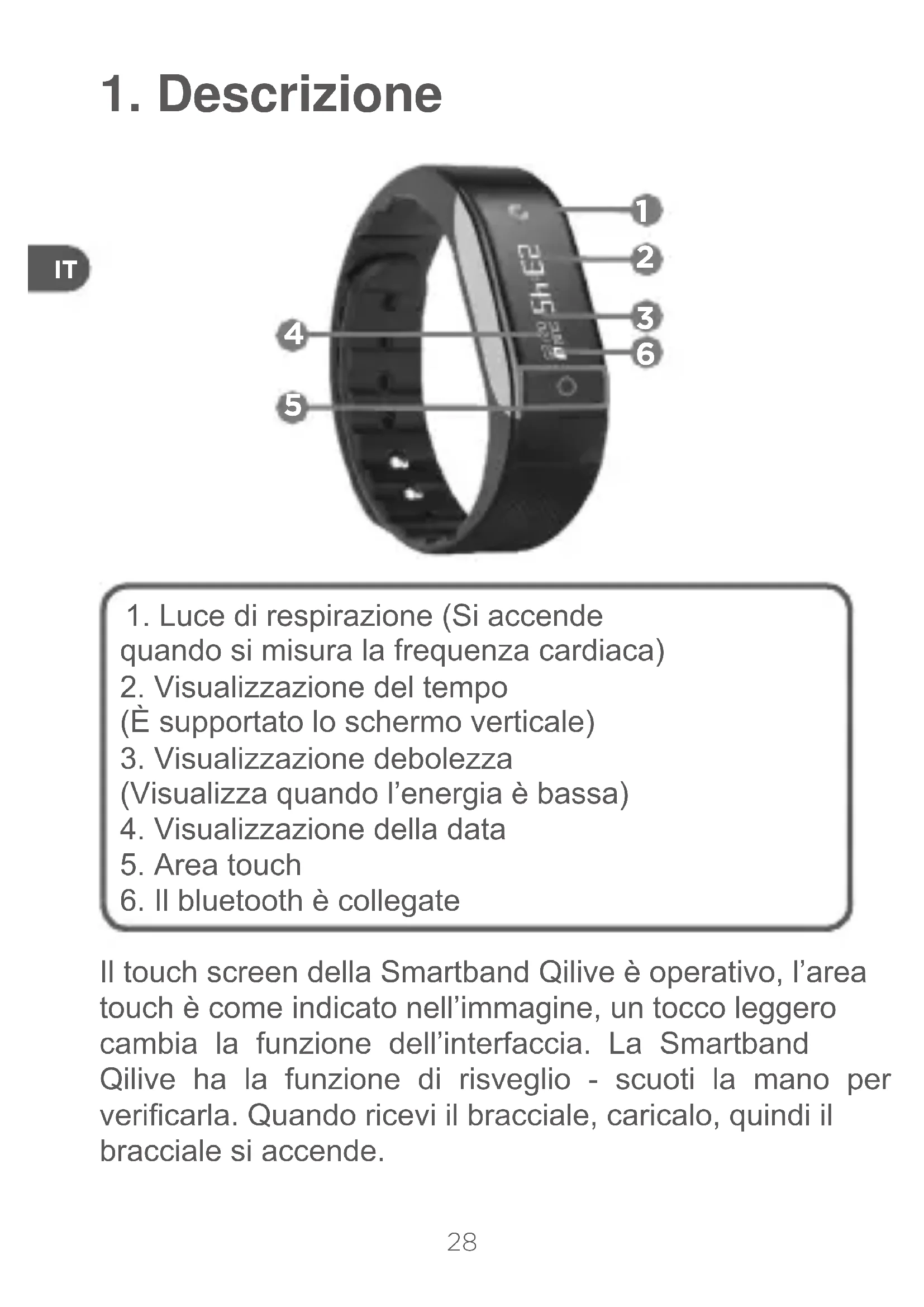 Il touch screen della Smartband Qilive è operativo, l’area touch è come indicato nell’immagine, un tocco leggero cambia la funzione dell’interfaccia. La Smartband Qilive ha la funzione di risveglio - scuoti la mano per vericarla. Quando ricevi il bracciale, caricalo, quindi il bracciale si accende.29
