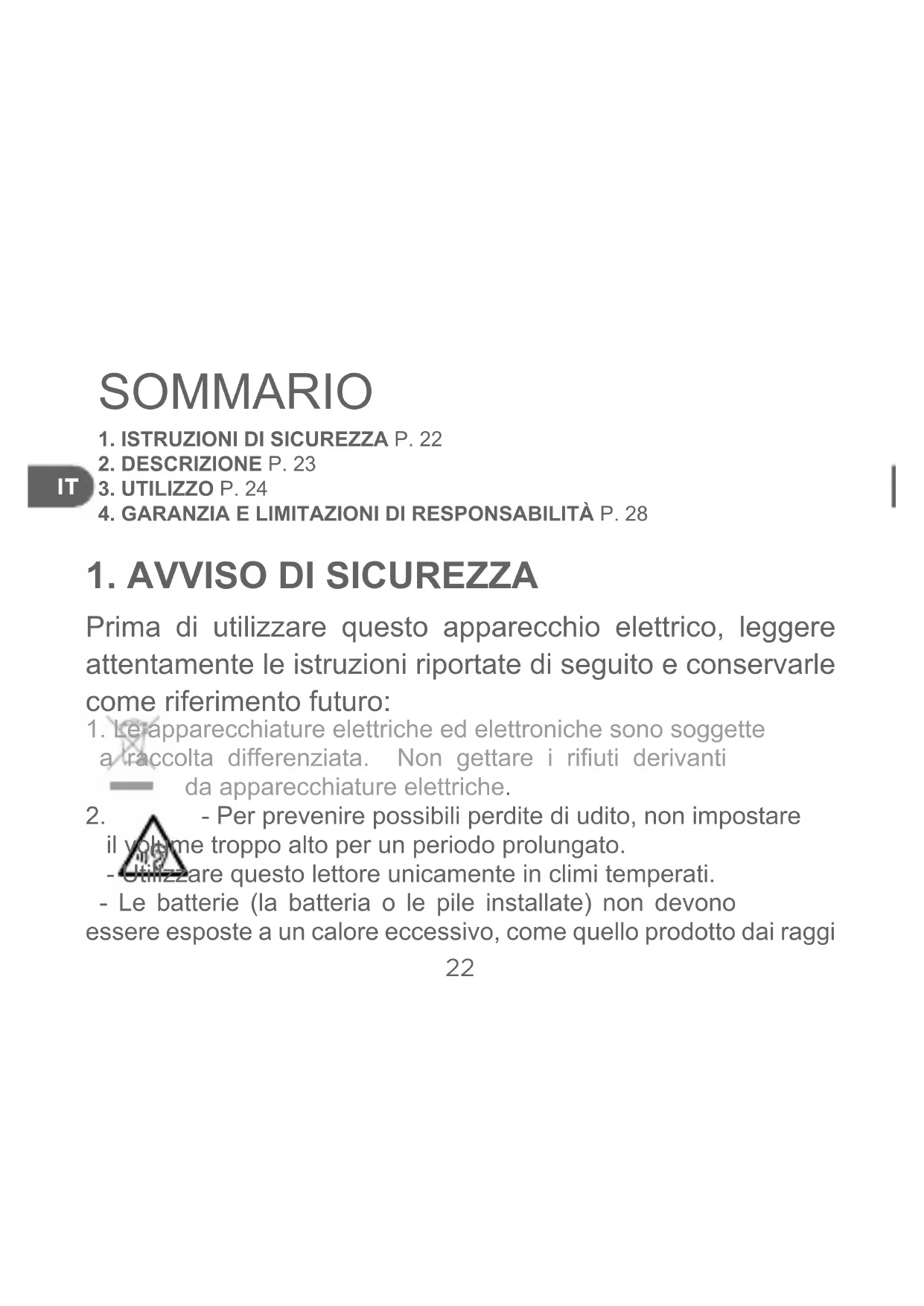 - Per prevenire possibili perdite di udito, non impostare il volume troppo alto per un periodo prolungato. - Utilizzare questo lettore unicamente in climi temperati. - Le batterie (la batteria o le pile installate) non devono essere esposte a un calore eccessivo, come quello prodotto dai raggiIT