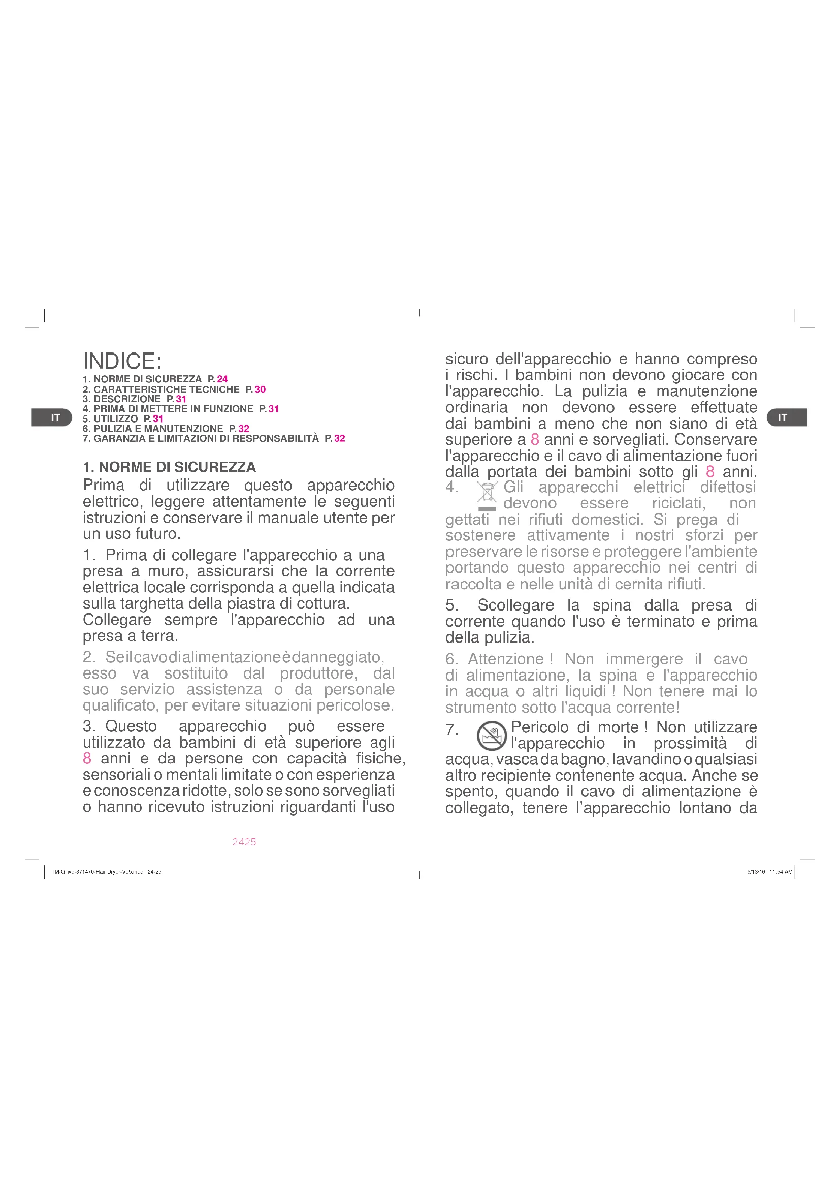 Pericolo di morte ! Non utilizzare l'apparecchio in prossimità di acqua, vasca da bagno, lavandino o qualsiasi altro recipiente contenente acqua. Anche se spento, quando il cavo di alimentazione è collegato, tenere l’apparecchio lontano da IM-Qilive-871470-Hair Dryer-V05.indd 24-25 5/13/16 11:54 AM26 27 acqua o altri liquidi.