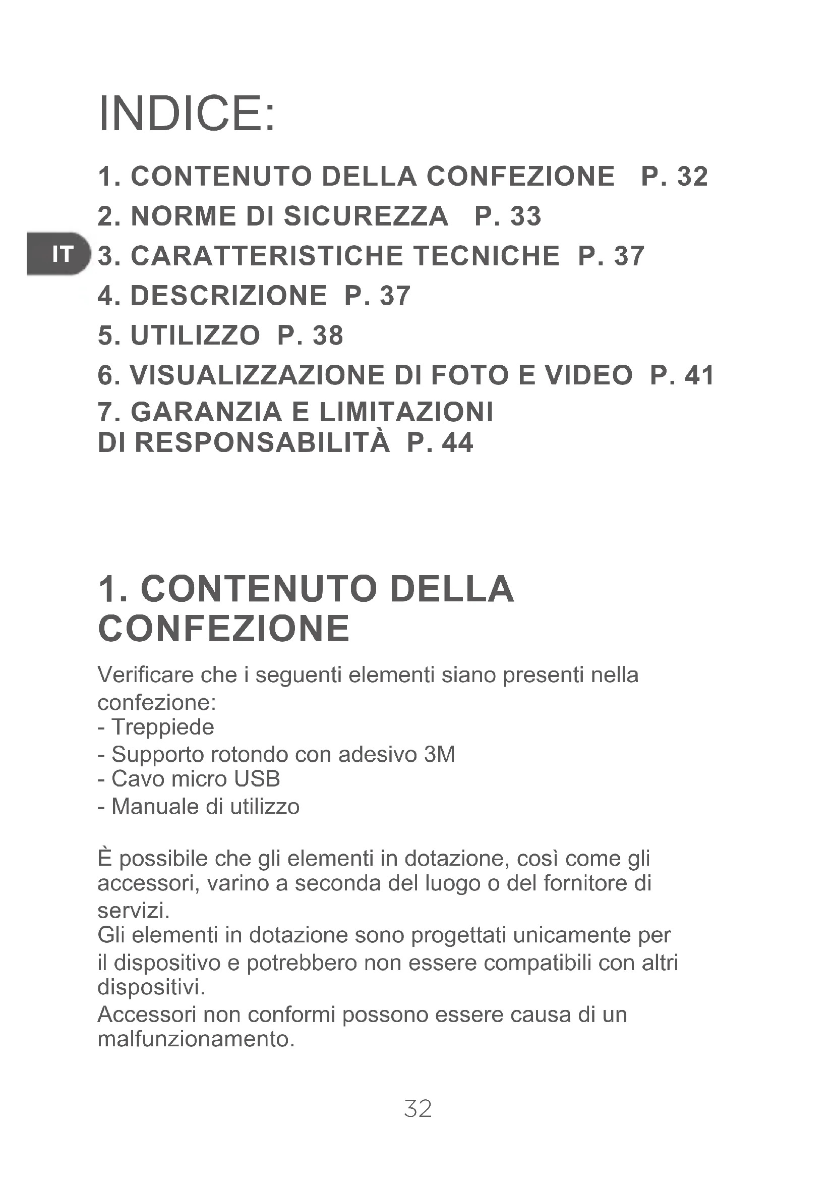 ConFezione Vericare che i seguenti elementi siano presenti nella confezione:- Treppiede- Supporto rotondo con adesivo 3M- Cavo micro USB- Manuale di utilizzoÈ possibile che gli elementi in dotazione, così come gli accessori, varino a seconda del luogo o del fornitore di servizi.Gli elementi in dotazione sono progettati unicamente per il dispositivo e potrebbero non essere compatibili con altri dispositivi. Accessori non conformi possono essere causa di un malfunzionamento.33