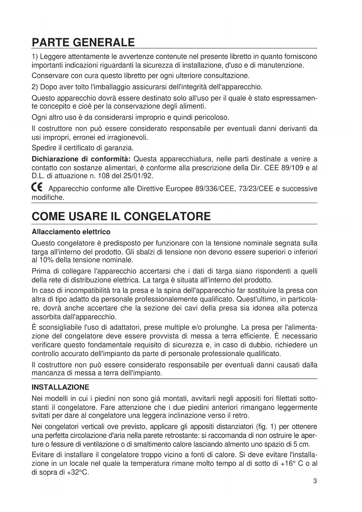 Allacciamento elettrico Questo congelatore è predisposto per funzionare con la tensione nominale segnata sulla targa all'interno del prodotto. Gli sbalzi di tensione non devono essere superiori o inferiori al 10% della tensione nominale. Prima di collegare l'apparecchio accertarsi che i dati di targa siano rispondenti a quelli della rete di distribuzione elettrica. La targa è situata all'interno del prodotto. In caso di incompatibilità tra la presa e la spina dell'apparecchio far sostituire la presa con altra di tipo adatto da personale professionalemente qualificato. Quest'ultimo, in particola- re, dovrà anche accertare che la sezione dei cavi della presa sia idonea alla potenza assorbita dall'apparecchio. È sconsigliabile l'uso di adattatori, prese multiple e/o prolunghe. La presa per l'alimenta- zione del congelatore deve essere provvista di messa a terra efficiente. È necessario verificare questo fondamentale requisito di sicurezza e, in caso di dubbio, richiedere un controllo accurato dell'impianto da parte di personale professionale qualificato. Il costruttore non può essere considerato responsabile per eventuali danni causati dalla mancanza di messa a terra dell'impianto. INSTALLAZIONE Nei modelli in cui i piedini non sono già montati, avvitarli negli appositi fori filettati sotto- stanti il congelatore. Fare attenzione che i due piedini anteriori rimangano leggermente svitati per dare al congelatore una leggera inclinazione verso il retro. Nei congelatori verticali ove previsto, applicare gli appositi distanziatori (fig. 1) per ottenere una perfetta circolazione d'aria nella parete retrostante: si raccomanda di non ostruire le aper- ture o fessure di ventilazione o di smaltimento calore lasciando almento uno spazio di 5 cm. Evitare di installare il congelatore troppo vicino a fonti di calore. Si deve evitare l'installa- zione in un locale nel quale la temperatura rimane molto tempo al di sotto di +16° C o al di sopra di +32°C. 3Il congelatore può essere anche installato sottopensile; in questo caso, bisogna che sia garantita la libera circolazione dell'aria, lasciando uno spazio libero di circa 5 centimetri frontalmente o nella parte posteriore del pensile. Una errata installazione può causare danni a persone, animali o cose, nei confronti dei quali il costruttore non può essere considerato responsabile.