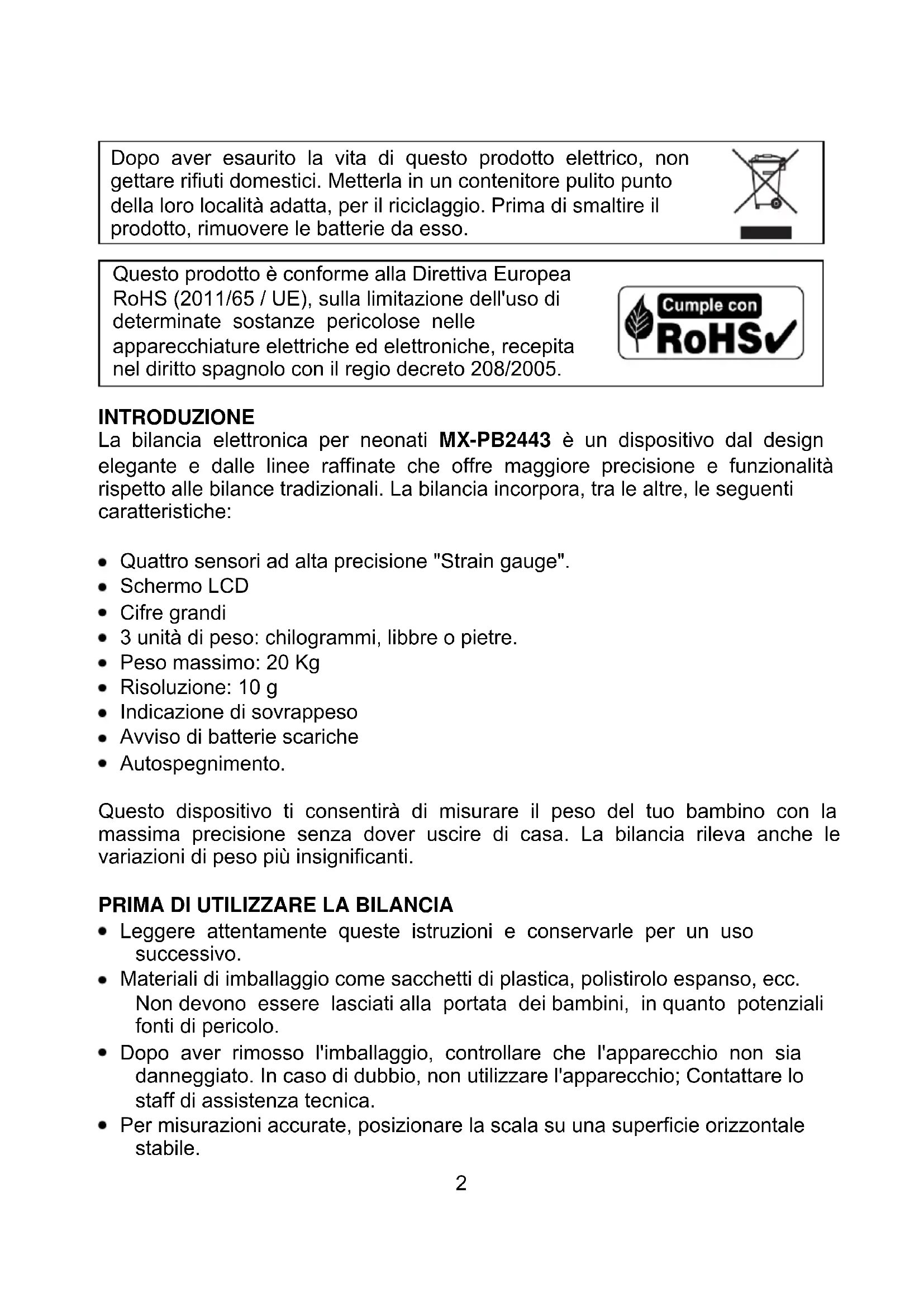 Questo prodotto è conforme alla Direttiva Europea RoHS (2011/65 / UE), sulla limitazione dell'uso di determinate sostanze pericolose nelle apparecchiature elettriche ed elettroniche, recepita nel diritto spagnolo con il regio decreto 208/2005. INTRODUZIONE La bilancia elettronica per neonati MX-PB2443 è un dispositivo dal design elegante e dalle linee raffinate che offre maggiore precisione e funzionalità rispetto alle bilance tradizionali. La bilancia incorpora, tra le altre, le seguenti caratteristiche: Quattro sensori ad alta precisione "Strain gauge". Schermo LCD Cifre grandi 3 unità di peso: chilogrammi, libbre o pietre. Peso massimo: 20 Kg Risoluzione: 10 g Indicazione di sovrappeso Avviso di batterie scariche Autospegnimento. Questo dispositivo ti consentirà di misurare il peso del tuo bambino con la massima precisione senza dover uscire di casa. La bilancia rileva anche le variazioni di peso più insignificanti.