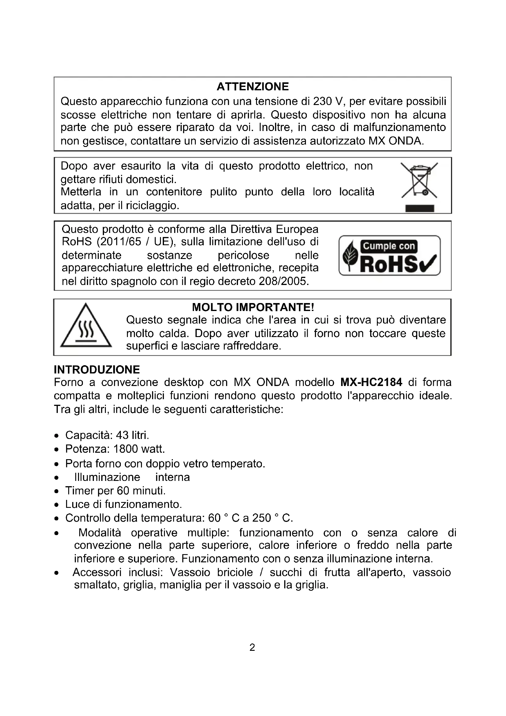 Questo prodotto è conforme alla Direttiva Europea RoHS (2011/65 / UE), sulla limitazione dell'uso di determinate sostanze pericolose nelle apparecchiature elettriche ed elettroniche, recepita nel diritto spagnolo con il regio decreto 208/2005. MOLTO IMPORTANTE! Questo segnale indica che l'area in cui si trova può diventare molto calda. Dopo aver utilizzato il forno non toccare queste superfici e lasciare raffreddare. INTRODUZIONE Forno a convezione desktop con MX ONDA modello MX-HC2184 di forma compatta e molteplici funzioni rendono questo prodotto l'apparecchio ideale. Tra gli altri, include le seguenti caratteristiche: