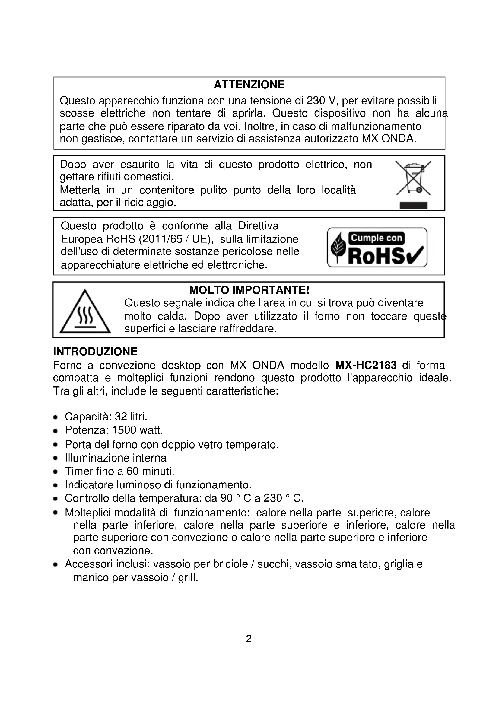 Questo prodotto è conforme alla Direttiva Europea RoHS (2011/65 / UE), sulla limitazione dell'uso di determinate sostanze pericolose nelle apparecchiature elettriche ed elettroniche. MOLTO IMPORTANTE! Questo segnale indica che l'area in cui si trova può diventare molto calda. Dopo aver utilizzato il forno non toccare queste superfici e lasciare raffreddare. INTRODUZIONE Forno a convezione desktop con MX ONDA modello MX-HC2183 di forma compatta e molteplici funzioni rendono questo prodotto l'apparecchio ideale. Tra gli altri, include le seguenti caratteristiche: Capacità: 32 litri. Potenza: 1500 watt. Porta del forno con doppio vetro temperato. Illuminazione interna Timer fino a 60 minuti. Indicatore luminoso di funzionamento. Controllo della temperatura: da 90 ° C a 230 ° C. Molteplici modalità di funzionamento: calore nella parte superiore, calore nella parte inferiore, calore nella parte superiore e inferiore, calore nella parte superiore con convezione o calore nella parte superiore e inferiore con convezione. Accessori inclusi: vassoio per briciole / succhi, vassoio smaltato, griglia e manico per vassoio / grill.