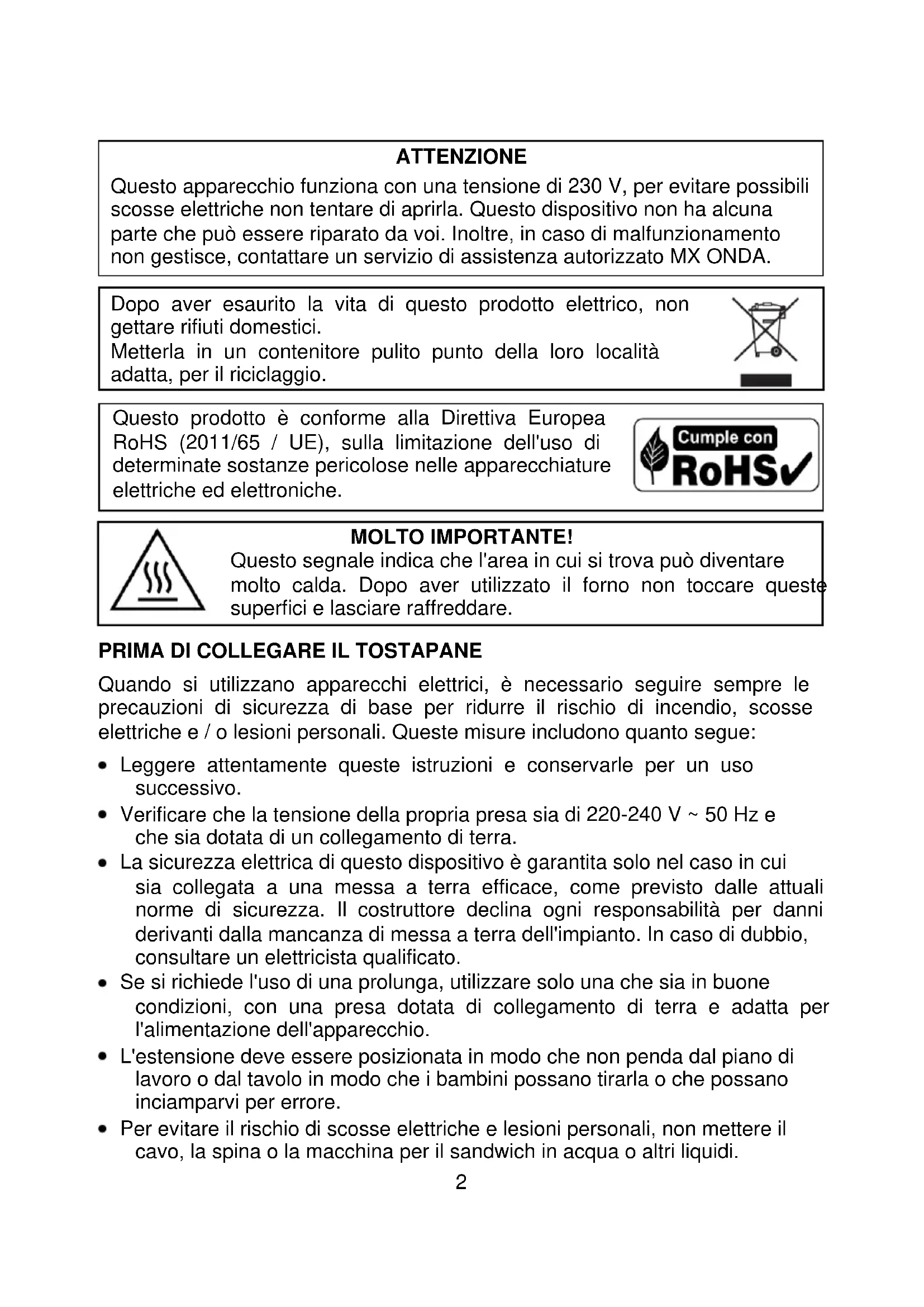 Questo prodotto non è un giocattolo, i bambini non dovrebbero giocare con questo dispositivo. La pulizia e la manutenzione che devono essere eseguite dall'utente non possono essere eseguite dai bambini, a meno che non abbiano più di 8 anni e siano supervisionate da un adulto. Questo dispositivo non può essere utilizzato da bambini (di età inferiore a 8 anni) o persone con o senza esperienza e conoscenza capacità fisiche, sensoriali o mentali ridotte, a meno che non abbiano ricevuto appropriata seguendo le istruzioni dell'apparecchio e alla supervisione di un adulto o persona responsabile. Questo dispositivo è progettato solo per uso domestico e non professionale. MX ONDA non accetterà alcuna responsabilità e la garanzia non sarà valida in caso di uso improprio o mancata osservanza delle istruzioni. Il panino incorpora una breve lunghezza del cavo di alimentazione per ridurre il rischio di lesioni personali che possono verificarsi con l'aggrovigliamento o inciampare nei fili lunghi. La mancata osservanza di queste avvertenze e istruzioni di sicurezza potrebbe provocare ustioni o gravi lesioni. Questo apparecchio funziona a temperature elevate, quindi durante la manipolazione NON toccare superfici calde. Tienilo per le maniglie. Se necessario, utilizzare guanti o guanti da forno. Mentre il tostapane è collegato o seguire caldo, non trascurare la loro vigilanza e tenerlo lontano dalla portata dei bambini. Posizionare sempre il tostapane su una superficie asciutta, stabile e piana, non utilizzarlo all'aperto.4 Per scollegare l'apparecchio dalla rete, estrarre delicatamente la spina dalla presa. Non farlo mai tirando il cavo. Accertarsi che il cavo non penda dal bordo del tavolo, dal controsoffitto o dal bancone o che tocchi superfici calde. Scollegare il tostapane e lasciarlo raffreddare prima di spostarlo o pulirlo. Durante il funzionamento può provocare un incendio se i tocchi panino o è vicino a un materiale infiammabile o materiali come tende, tendaggi, etc. L'uso di accessori non raccomandati dal produttore dell'apparecchio può causare incendi, scosse elettriche o lesioni personali. Scollegare il panino, quando non è in uso o quando si verifica un'interruzione di corrente, o "saltare" un fusibile o circuito e prima della corretta pulizia manutenzione. Non posizionare il tostapane su o vicino a fornelli a gas, piastre riscaldanti o forni caldi. In caso di guasto, anomalie, sì, il panino è caduto, la spina o altre parti sono considerati alterata, o il cavo è danneggiato, non collegare l'apparecchio e non tentare di ripararlo da soli. Contattare il servizio tecnico ufficiale MX ONDA più vicino.
