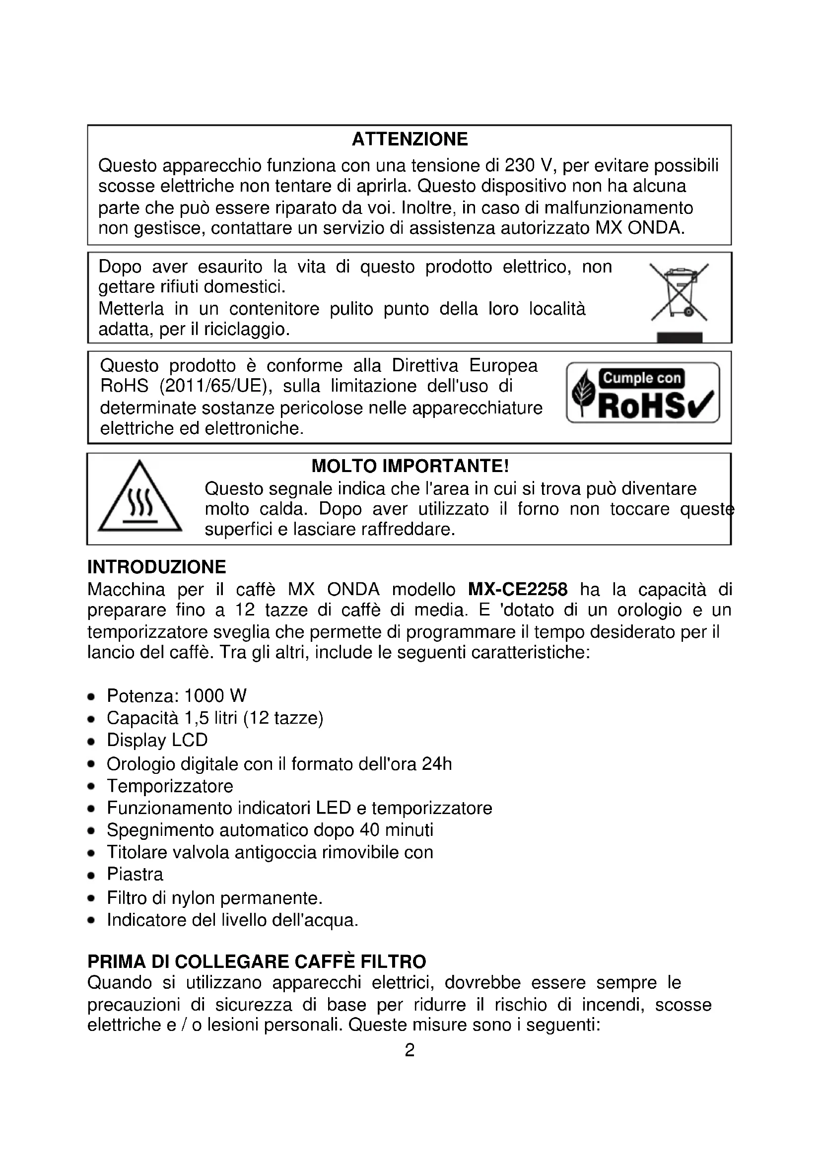 Questo prodotto è conforme alla Direttiva Europea RoHS (2011/65/UE), sulla limitazione dell'uso di determinate sostanze pericolose nelle apparecchiature elettriche ed elettroniche. MOLTO IMPORTANTE! Questo segnale indica che l'area in cui si trova può diventare molto calda. Dopo aver utilizzato il forno non toccare queste superfici e lasciare raffreddare. INTRODUZIONE Macchina per il caffè MX ONDA modello MX-CE2258 ha la capacità di preparare fino a 12 tazze di caffè di media. E 'dotato di un orologio e un temporizzatore sveglia che permette di programmare il tempo desiderato per il lancio del caffè. Tra gli altri, include le seguenti caratteristiche: Potenza: 1000 W Capacità 1,5 litri (12 tazze) Display LCD Orologio digitale con il formato dell'ora 24h Temporizzatore Funzionamento indicatori LED e temporizzatore Spegnimento automatico dopo 40 minuti Titolare valvola antigoccia rimovibile con Piastra Filtro di nylon permanente. Indicatore del livello dell'acqua.