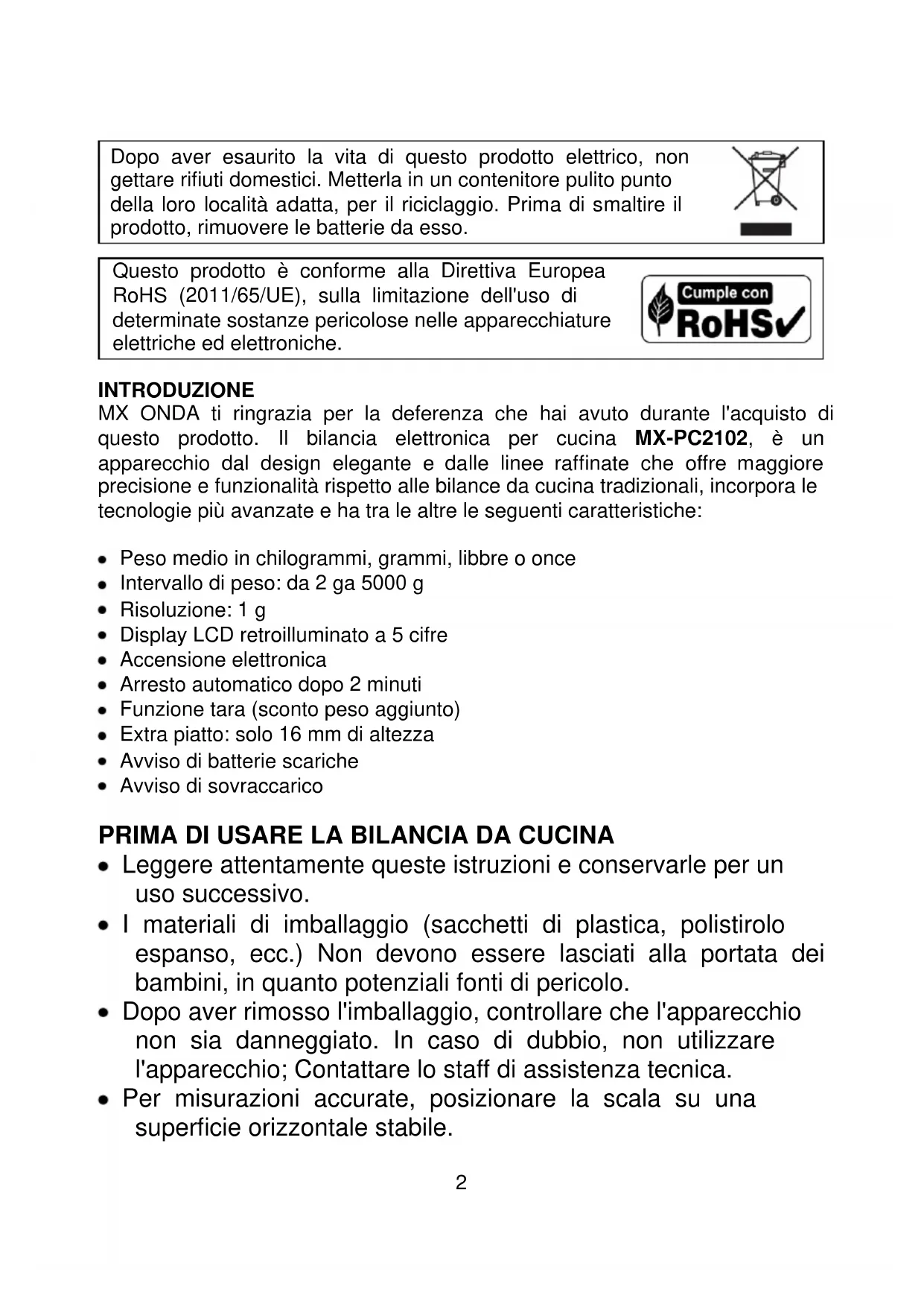 Questo prodotto è conforme alla Direttiva Europea RoHS (2011/65/UE), sulla limitazione dell'uso di determinate sostanze pericolose nelle apparecchiature elettriche ed elettroniche. INTRODUZIONE MX ONDA ti ringrazia per la deferenza che hai avuto durante l'acquisto di questo prodotto. Il bilancia elettronica per cucina MX-PC2102, è un apparecchio dal design elegante e dalle linee raffinate che offre maggiore precisione e funzionalità rispetto alle bilance da cucina tradizionali, incorpora le tecnologie più avanzate e ha tra le altre le seguenti caratteristiche: Peso medio in chilogrammi, grammi, libbre o once Intervallo di peso: da 2 ga 5000 g Risoluzione: 1 g Display LCD retroilluminato a 5 cifre Accensione elettronica Arresto automatico dopo 2 minuti Funzione tara (sconto peso aggiunto) Extra piatto: solo 16 mm di altezza Avviso di batterie scariche Avviso di sovraccarico PRIMA DI USARE LA BILANCIA DA CUCINA Leggere attentamente queste istruzioni e conservarle per un uso successivo. I materiali di imballaggio (sacchetti di plastica, polistirolo espanso, ecc.) Non devono essere lasciati alla portata dei bambini, in quanto potenziali fonti di pericolo. Dopo aver rimosso l'imballaggio, controllare che l'apparecchio non sia danneggiato. In caso di dubbio, non utilizzare l'apparecchio; Contattare lo staff di assistenza tecnica. Per misurazioni accurate, posizionare la scala su una superficie orizzontale stabile.