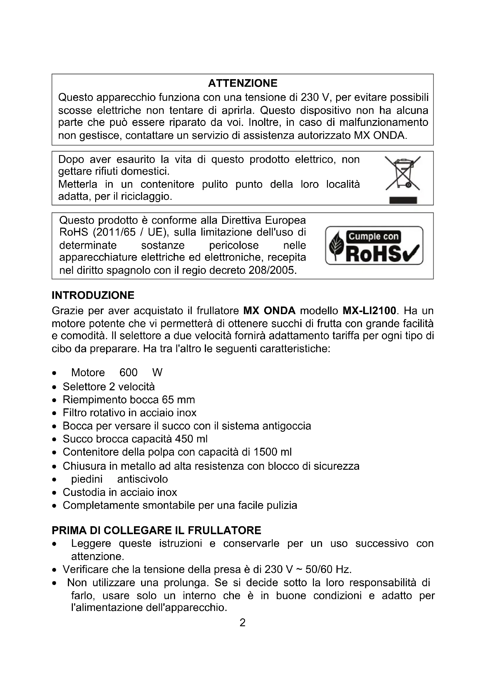 Grazie per aver acquistato il frullatore MX ONDA modello MX-LI2100. Ha un motore potente che vi permetterà di ottenere succhi di frutta con grande facilità e comodità. Il selettore a due velocità fornirà adattamento tariffa per agli tipo di cibo da preparare. Ha tra l'alto le seguenti caratteristiche: