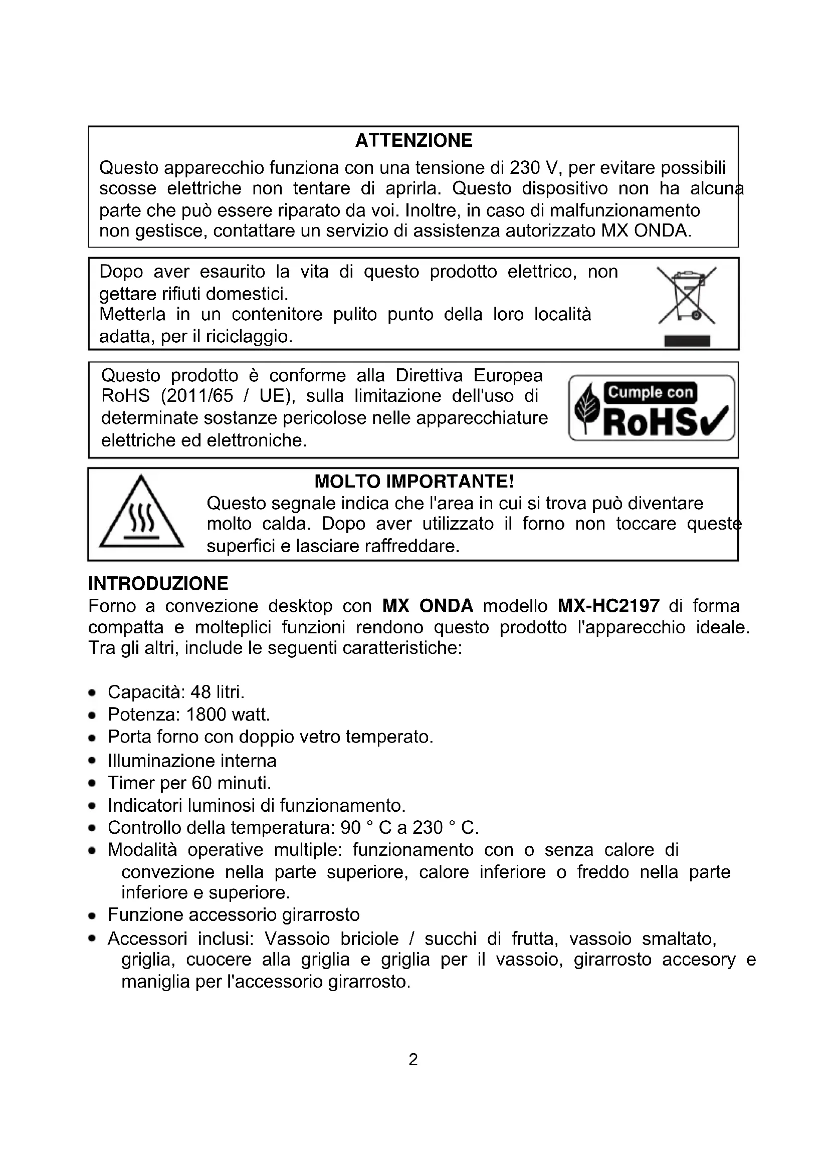 Questo prodotto è conforme alla Direttiva Europea RoHS (2011/65 / UE), sulla limitazione dell'uso di determinate sostanze pericolose nelle apparecchiature elettriche ed elettroniche. MOLTO IMPORTANTE! Questo segnale indica che l'area in cui si trova può diventare molto calda. Dopo aver utilizzato il forno non toccare queste superfici e lasciare raffreddare. INTRODUZIONE Forno a convezione desktop con MX ONDA modello MX-HC2197 di forma compatta e molteplici funzioni rendono questo prodotto l'apparecchio ideale. Tra gli altri, include le seguenti caratteristiche: Capacità: 48 litri. Potenza: 1800 watt. Porta forno con doppio vetro temperato. Illuminazione interna Timer per 60 minuti. Indicatori luminosi di funzionamento. Controllo della temperatura: 90 ° C a 230 ° C. Modalità operative multiple: funzionamento con o senza calore di convezione nella parte superiore, calore inferiore o freddo nella parte inferiore e superiore. Funzione accessorio girarrosto Accessori inclusi: Vassoio briciole / succhi di frutta, vassoio smaltato, griglia, cuocere alla griglia e griglia per il vassoio, girarrosto accesory e maniglia per l'accessorio girarrosto.
