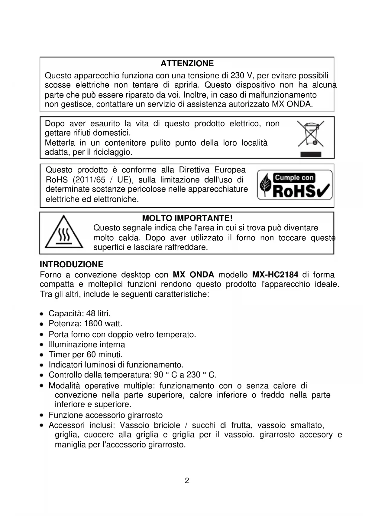Scarica le istruzioni per il tuo Forno in formato PDF gratuitamente! Trova il tuo manuale MXHC2184 - Mx Onda e riprendi in mano il tuo dispositivo elettronico. In questa pagina sono pubblicati tutti i documenti necessari per l'utilizzo del tuo dispositivo. MXHC2184 del marchio Mx Onda.