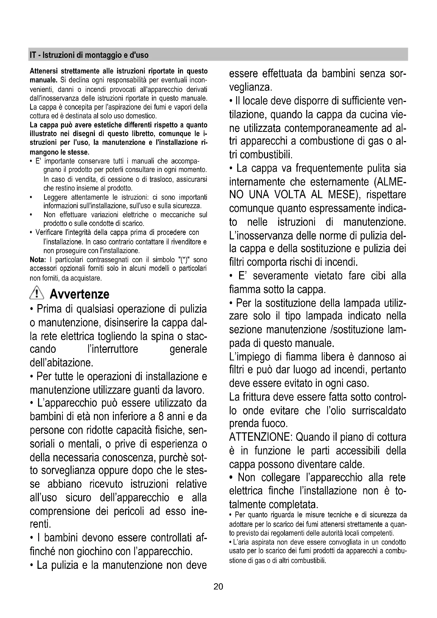 Monteer het rooster weer terug. Als een lampje het niet doet, kijkt u of ze goed zijn geplaatst voordat u om technische ondersteuning vraagt.20 IT - Istruzioni di montaggio e d'uso Attenersi strettamente alle istruzioni riportate in questo manuale. Si declina ogni responsabilità per eventuali incon- venienti, danni o incendi provocati all'apparecchio derivati dall'inosservanza delle istruzioni riportate in questo manuale. La cappa è concepita per l'aspirazione dei fumi e vapori della cottura ed è destinata al solo uso domestico. La cappa può avere estetiche differenti rispetto a quanto illustrato nei disegni di questo libretto, comunque le i- struzioni per l'uso, la manutenzione e l'installazione ri- mangono le stesse.