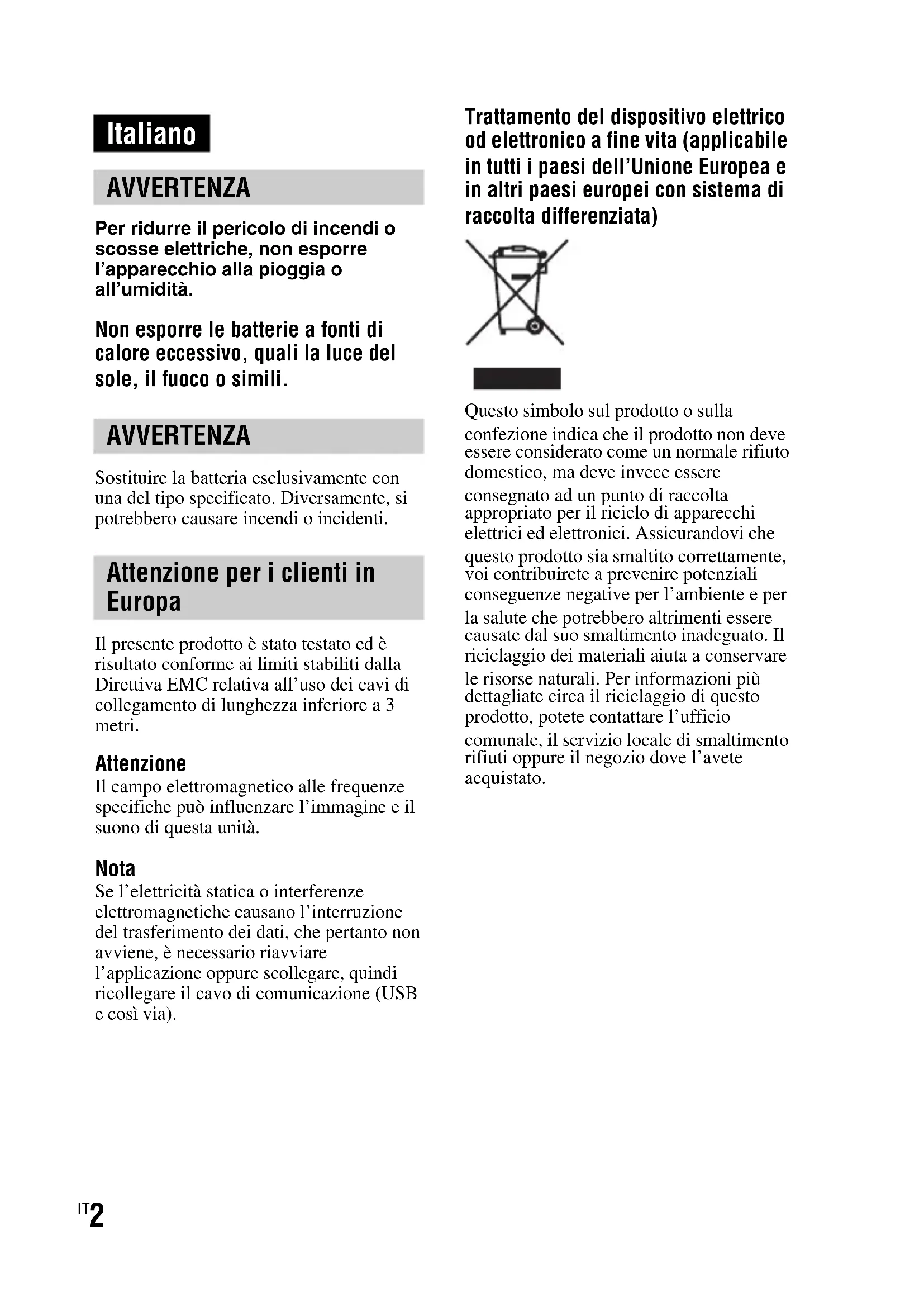 Il presente prodotto è stato testato ed è risultato conforme ai limiti stabiliti dalla Direttiva EMC relativa all’uso dei cavi di collegamento di lunghezza inferiore a 3 metri. Attenzione Il campo elettromagnetico alle frequenze specifiche può influenzare l’immagine e il suono di questa unità. Nota Se l’elettricità statica o interferenze elettromagnetiche causano l’interruzione del trasferimento dei dati, che pertanto non avviene, è necessario riavviare l’applicazione oppure scollegare, quindi ricollegare il cavo di comunicazione (USB e così via). Trattamento del dispositivo elettrico od elettronico a fine vita (applicabile in tutti i paesi dell’Unione Europea e in altri paesi europei con sistema di raccolta differenziata) Questo simbolo sul prodotto o sulla confezione indica che il prodotto non deve essere considerato come un normale rifiuto domestico, ma deve invece essere consegnato ad un punto di raccolta appropriato per il riciclo di apparecchi elettrici ed elettronici. Assicurandovi che questo prodotto sia smaltito correttamente, voi contribuirete a prevenire potenziali conseguenze negative per l’ambiente e per la salute che potrebbero altrimenti essere causate dal suo smaltimento inadeguato. Il riciclaggio dei materiali aiuta a conservare le risorse naturali. Per informazioni più dettagliate circa il riciclaggio di questo prodotto, potete contattare l’ufficio comunale, il servizio locale di smaltimento rifiuti oppure il negozio dove l’avete acquistato. Italiano AVVERTENZA AVVERTENZA Attenzione per i clienti in Europa3