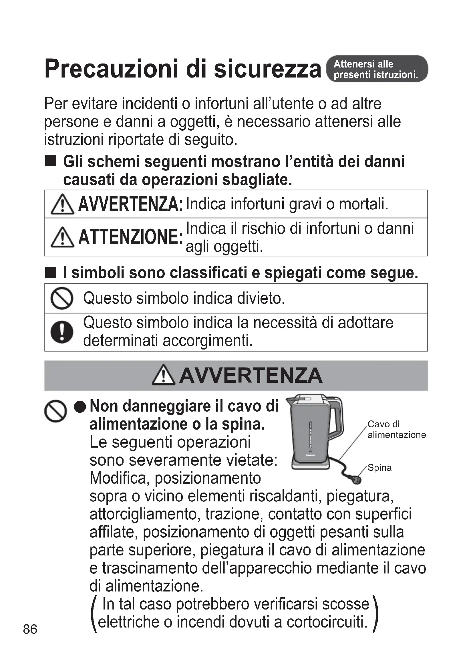 Precauzioni di sicurezza Attenersi alle presenti istruzioni.87 Italiano AVVERTENZA Non utilizzare l’apparecchio se il cavo di