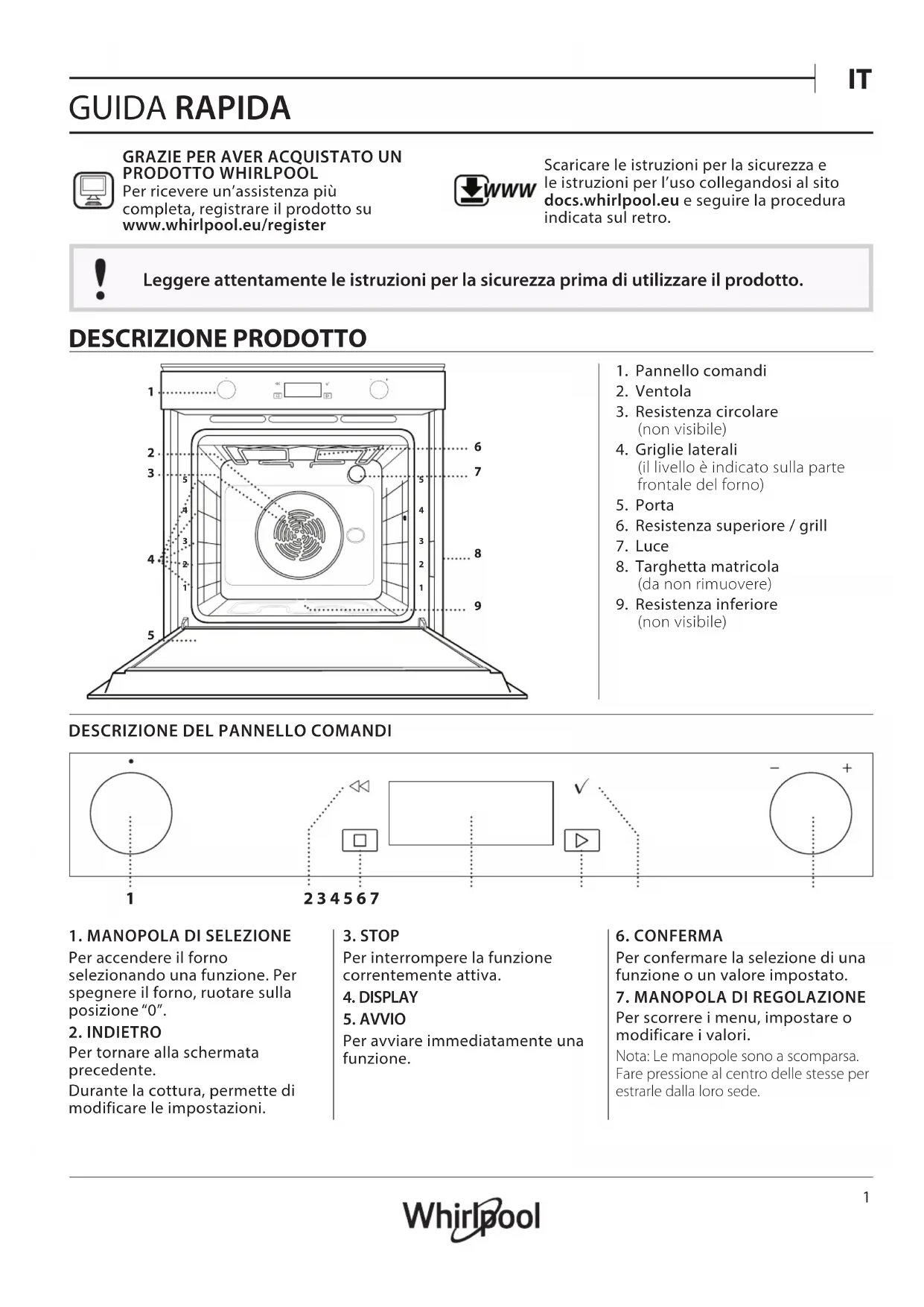 GUIDA RAPIDA GRAZIE PER AVER ACQUISTATO UN PRODOTTO WHIRLPOOLPer ricevere un’assistenza più completa, registrare il prodotto su www . whirlpool . eu/ register WWW Scaricare le istruzioni per la sicurezza e le istruzioni per l’uso collegandosi al sito docs. whirlpool . eu e seguire la procedura indicata sul retro. Leggere attentamente le istruzioni per la sicurezza prima di utilizzare il prodotto. DESCRIZIONE PRODOTTO 1. Pannello comandi2. Ventola3. Resistenza circolare (non visibile)4. Griglie laterali (il livello è indicato sulla parte frontale del forno)5. Porta6. Resistenza superiore / grill7. Luce8. Targhetta matricola (da non rimuovere)9. Resistenza inferiore (non visibile)DESCRIZIONE DEL PANNELLO COMANDI 2 3 4 5 6 71. MANOPOLA DI SELEZIONEPer accendere il forno selezionando una funzione. Per spegnere il forno, ruotare sulla posizione “0”.2. INDIETROPer tornare alla schermata precedente.Durante la cottura, permette di modificare le impostazioni.3. STOPPer interrompere la funzione correntemente attiva.4. DISPLAY5. AVVIOPer avviare immediatamente una funzione.6. CONFERMAPer confermare la selezione di una funzione o un valore impostato.7. MANOPOLA DI REGOLAZIONEPer scorrere i menu, impostare o modificare i valori.Nota: Le manopole sono a scomparsa. Fare pressione al centro delle stesse per estrarle dalla loro sede.
