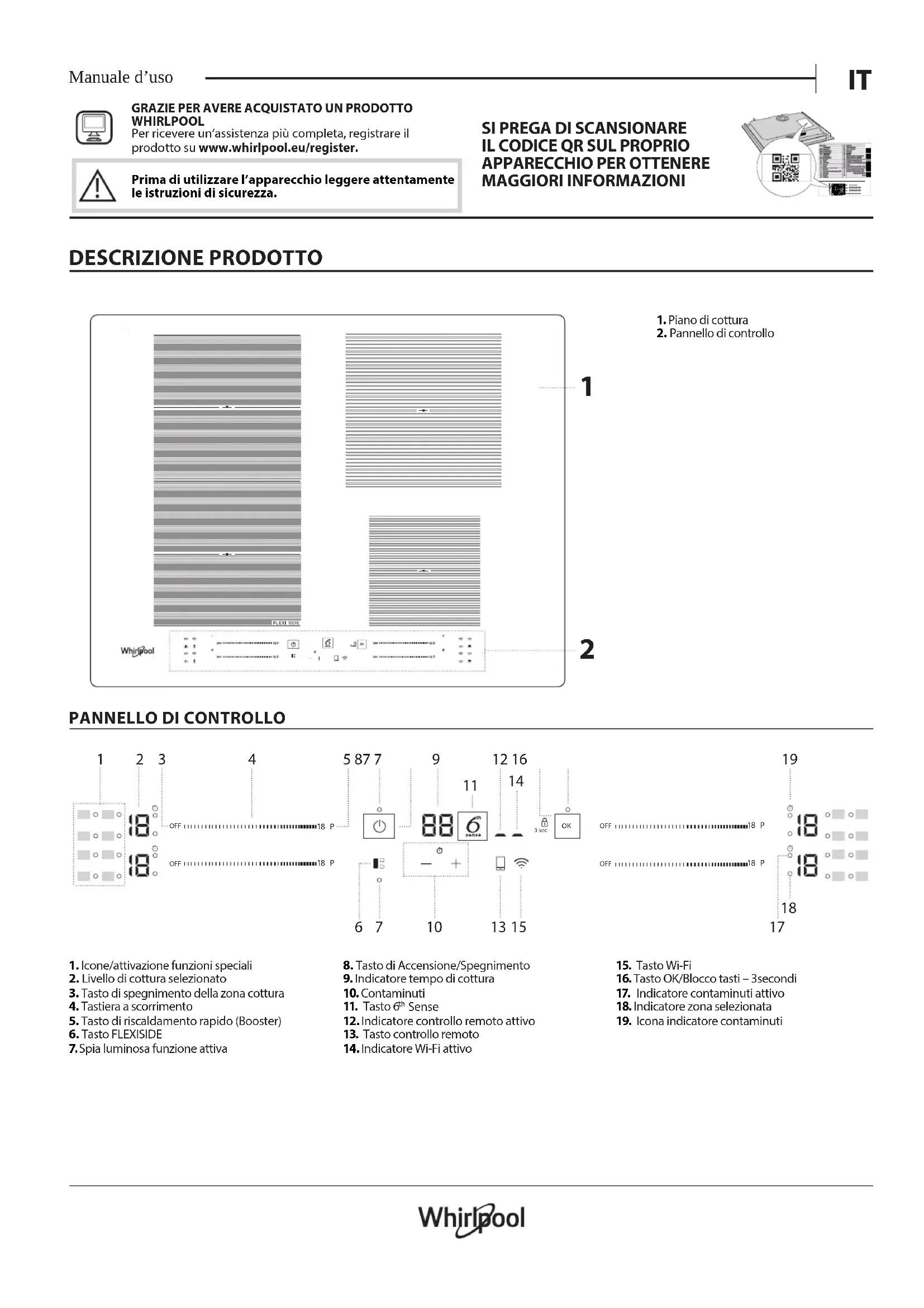 - il proprio numero di telefono. Qualora si renda necessaria una riparazione, rivolgersi ad un centro del Servizio Assistenza (a garanzia dell’utilizzo di pezzi di ricambio originali e di una corretta riparazione). Nel caso di installazione a incasso, contattare il Servizio Assistenza per richiedere il kit di viti (se non presente). In caso di installazione non sopra un forno da incasso, è possibile chiamare il Servizio Post Vendita per acquistare il kit divisore C00628720 (piano cottura 60 e 65 cm) o C00628721 (piano cottura 77 cm). Se si preferisce non acquistare il kit divisore, assicurarsi che venga installato un divisore secondo le istruzioni di installazione. Cosa si può fare se il LED del Wi-Fi lampeggia o se l'apparecchio non riesce a stabilire una connessione stabile con il router? È possibile che l’apparecchio si colleghi al router ma non riesca ad accedere a Internet. Per collegare l’apparecchio a Internet, controllare le impostazioni del router e/o della linea. Impostazioni del router: NAT deve essere attivo, Firewall e DHCP devono essere congurati correttamente. Tipi di crittograa supportati per le password: WEP, WPA,WPA2. Se si desidera usare un tipo di crittograa dierente, consultare il manuale del router. Impostazioni della linea: se il provider del servizio Internet ha stabilito il numero di indirizzi MAC che possono collegarsi a Internet, può darsi che non si riesca a collegare l’apparecchio al cloud. L’indirizzo MAC è un identicatore univoco ed è diverso per ogni dispositivo. Si dovrà chiedere al provider la procedura da seguire per collegare a Internet altri dispositivi diversi dai computer. Come si può controllare se i dati vengono trasmessi? Dopo avere congurato la rete, spegnere l’apparecchio, attendere 20 secondi e riaccenderlo; vericare che l’app mostri lo stato dell’interfaccia utente dell’apparecchio. Alcune impostazioni impiegano diversi secondi per comparire nell’app. Si può modificare l’account Whirlpool mantenendo connessi gli apparecchi? È possibile creare un nuovo account, ma occorre ricordarsi di revocare l’associazione dei propri apparecchi al vecchio account prima di associarli a quello nuovo. Cosa occorre fare se si cambia il router? Se è possibile mantenere il nome e la password di rete precedenti sul nuovo router, non è necessario eseguire nuove azioni in quanto l'apparecchio si connetterà automaticamente. In caso contrario, per collegare l'apparecchio alla nuova rete, premere “+“ nella home page dell'app senza deselezionare l'apparecchio e seguire le istruzioni sull'app. Per le linee guida, la documentazione standard e altre informazioni sui prodotti:
