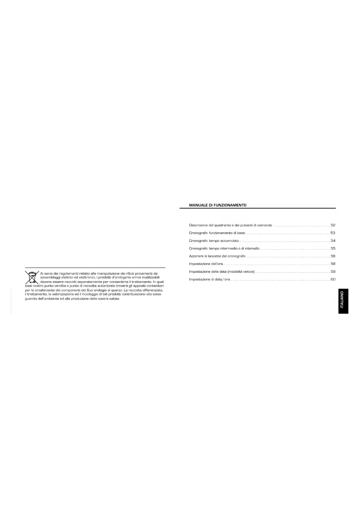 CRONOGRAFO Esempio: Una delle varie lancette del cronografo non si trova nella posizione corretta (a zero) e va pertanto regolata (ad es. dopo la sostituzio- ne della pila). Estrarre la corona in posizione III (tutte e 3 le lancette del cronografo si trovano a zero in posizione corretta o incorretta). Tenere premuti simultaneamente i pulsanti A e B per almeno 2 secondi (la lancetta secondi al centro ruota di 360° la modalità di regolazione è attivata). Ritorno della corona in posizione I Fine della regolazione delle lancette del cronografo (eseguibile in qualsiasi momento). Regolazione lancetta sec. centro Una volta A 1 x breve Continuamente A a lungo Regolazione della lancetta successiva B Regolazione della lancetta del contasecundi 1/10 (posizione 6 ore) Una volta A 1 x breve Continuamente A a lungo Regolazione della lancetta successiva B Regolazione della lancetta del contaminuti (pos. 9 ore) Una volta A 1 x breve Continuamente A a lungo Pulsante B Pulsante A Contasecondi 1/10 Contasecondi centrale Contaminuti ItalIano58 59 IMpostaZIonE DEll’ora IMpostaZIonE DElla Data (MoDalItÀ VEloCE) Estrarre la corona in posizione III (l’orologio si ferma).