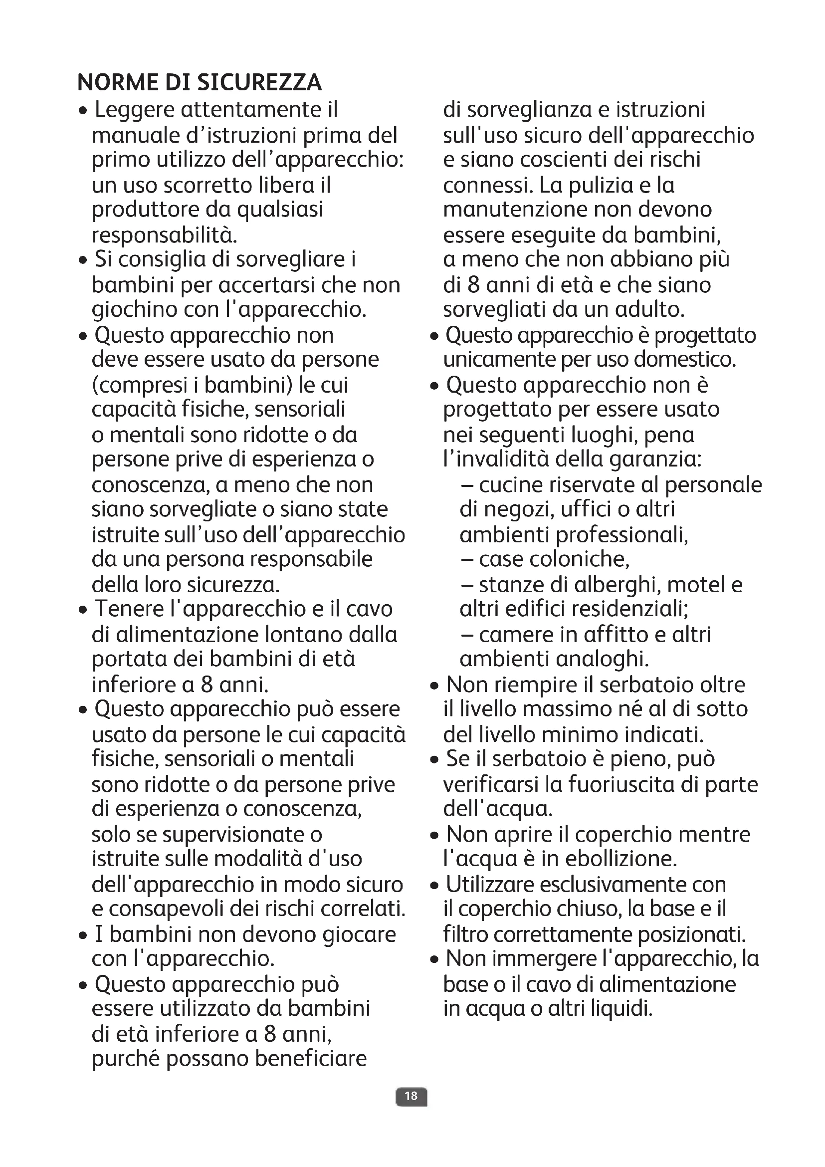 - Questo apparecchio può essere utilizzato da bambini di età inferiore a 8 anni, purché possano beneficiare di sorveglianza e istruzioni sull'uso sicuro dell'apparecchio e siano coscienti dei rischi connessi. La pulizia e la manutenzione non devono essere eseguite da bambini, a meno che non abbiano più di 8 anni di età e che siano sorvegliati da un adulto.