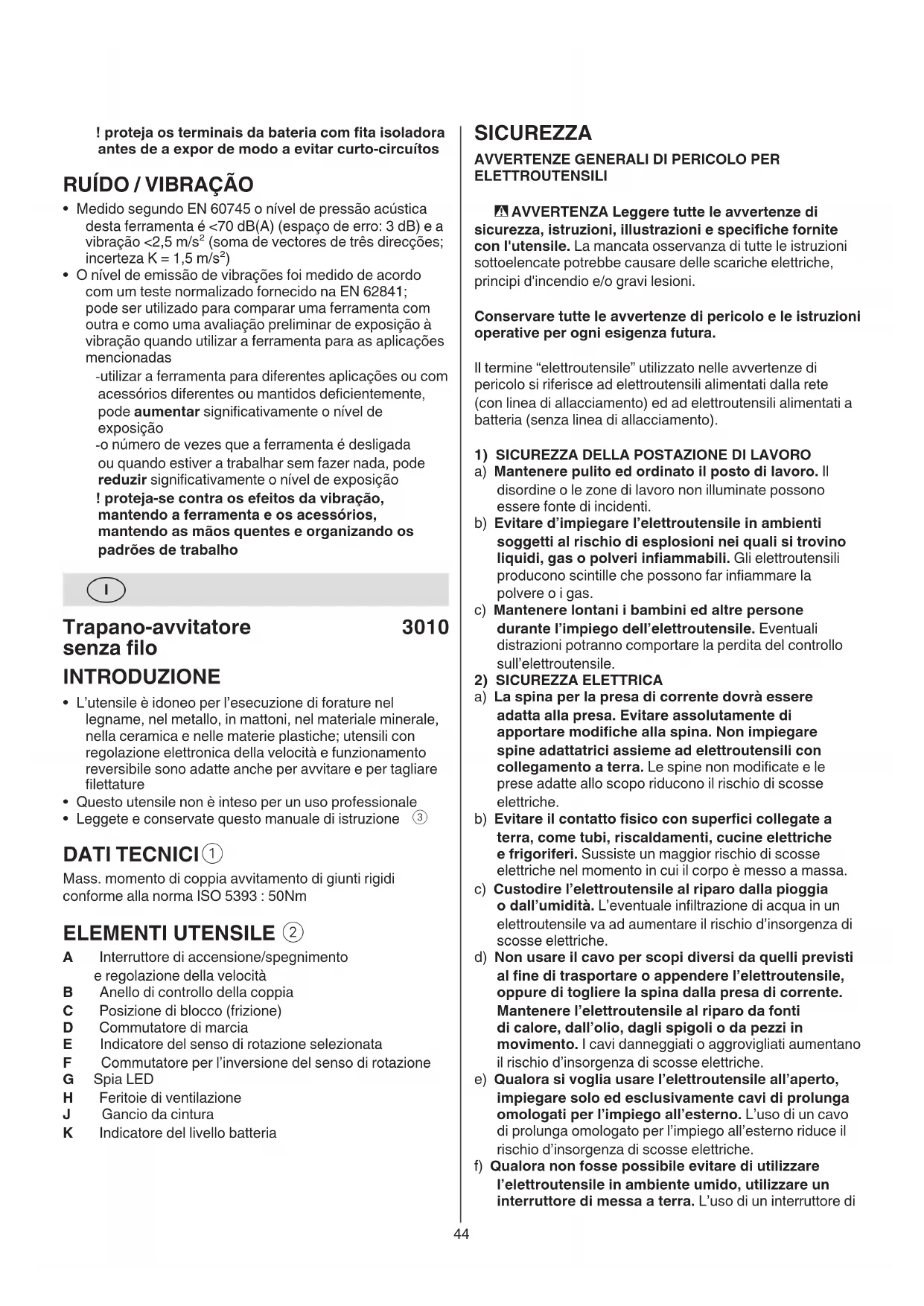 A Interruttore di accensione/spegnimento e regolazione della velocità B Anello di controllo della coppia C Posizione di blocco (frizione) D Commutatore di marcia E Indicatore del senso di rotazione selezionata F Commutatore per l’inversione del senso di rotazione G Spia LED H Feritoie di ventilazione J Gancio da cintura K Indicatore del livello batteria45 al termine di un lavoro, estrarre sempre la spina dalla presa della corrente e/o estrarre la batteria ricaricabile, se rimovibile. Tale precauzione eviterà che l’elettroutensile possa essere messo in funzione inavvertitamente. d) Custodire gli elettroutensili non utilizzati al di fuori della portata dei bambini. Non fare usare l’elettroutensile a persone che non sono abituate ad usarlo o che non abbiano letto le presenti istruzioni. Gli elettroutensili sono pericolosi se utilizzati da persone inesperte. e) Eseguire la manutenzione degli elettroutensili e degli accessori. Vericare che le parti mobili dell’elettroutensile funzionino perfettamente e non s’inceppino, che non ci siano pezzi rotti o danneggiati al punto tale da limitare la funzione dell’elettroutensile stesso. Far riparare le parti danneggiate prima d’impiegare l’elettroutensile. Numerosi incidenti vengono causati da elettroutensili la cui manutenzione è stata eettuata poco accuratamente. f) Mantenere alati e puliti gli elettroutensili da taglio. Gli elettroutensili da taglio curati con particolare attenzione e con taglienti alati s’inceppano meno frequentemente e sono più facili da condurre. g) Utilizzare elettroutensili, accessori, attrezzi, ecc. in conformità con le presenti istruzioni. Osservare le condizioni di lavoro ed il lavoro da eseguirsi durante l’impiego. L’impiego di elettroutensili per usi diversi da quelli consentiti potrà dar luogo a situazioni di pericolo. h) Mantenere impugnature e superci di presa asciutte, pulite e prive di olio e grasso. Impugnature e superci di presa scivolose non consentono di manipolare e controllare l’utensile in caso di situazioni inaspettate.