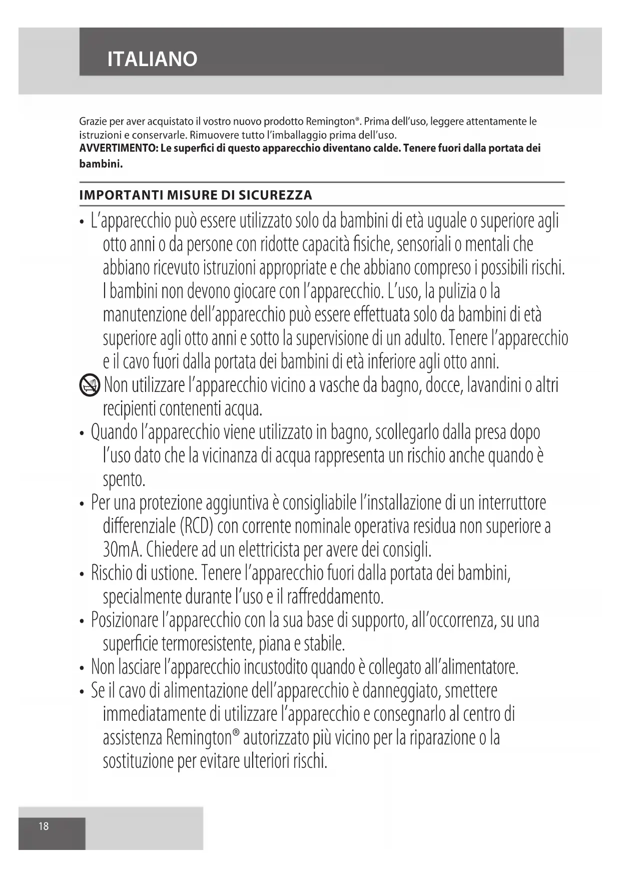 - Se il cavo di alimentazione dell’apparecchio è danneggiato, smettere immediatamente di utilizzare l’apparecchio e consegnarlo al centro di assistenza Remington® autorizzato più vicino per la riparazione o la sostituzione per evitare ulteriori rischi. ITALIANO19 ITALIANO