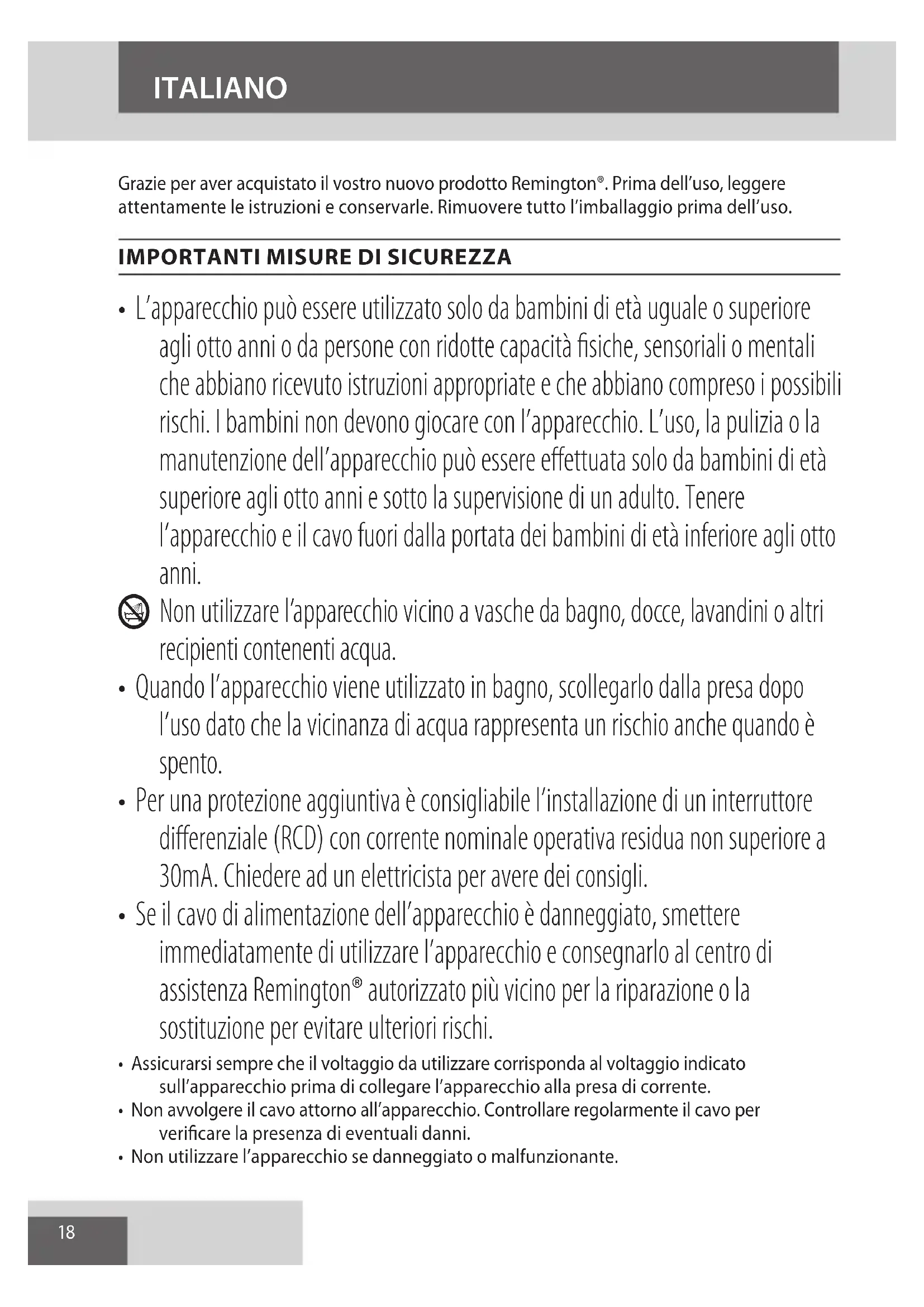 AE18 ITALIANO Grazie per aver acquistato il vostro nuovo prodotto Remington®. Prima dell’uso, leggere attentamente le istruzioni e conservarle. Rimuovere tutto l’imballaggio prima dell’uso.