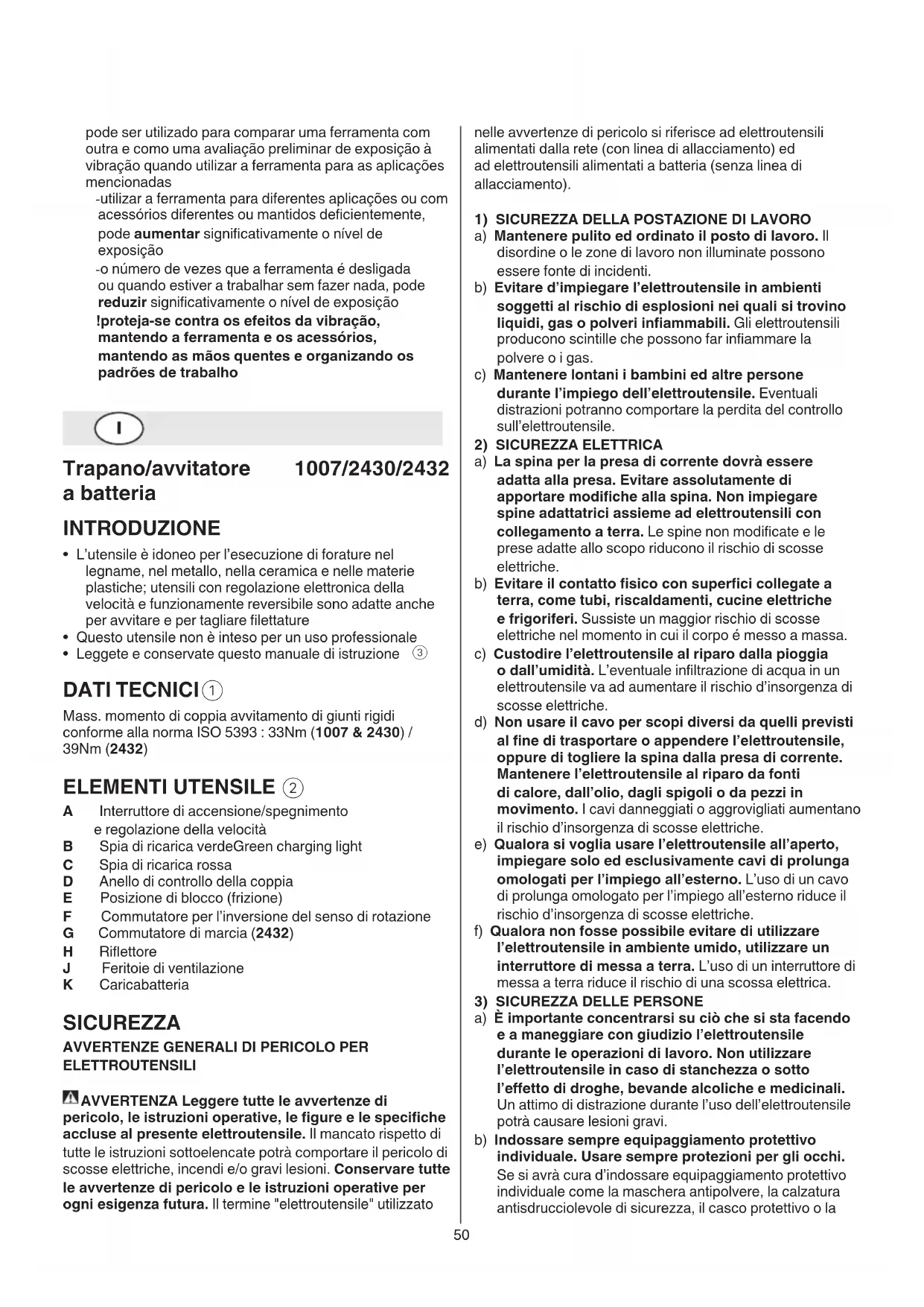 A Interruttore di accensione/spegnimento e regolazione della velocità B Spia di ricarica verdeGreen charging light C Spia di ricarica rossa D Anello di controllo della coppia E Posizione di blocco (frizione) F Commutatore per l’inversione del senso di rotazione G Commutatore di marcia (2432) H Riettore J Feritoie di ventilazione K Caricabatteria SICUREZZA