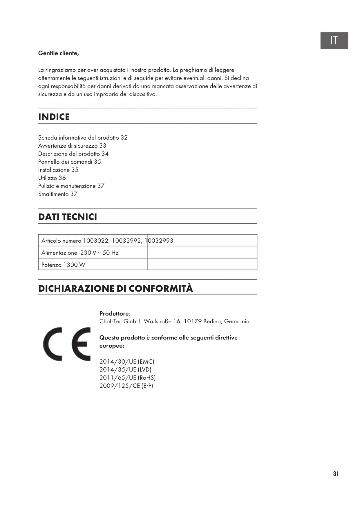 Produttore: Chal-Tec GmbH, Wallstraße 16, 10179 Berlino, Germania. Questo prodotto è conforme alle seguenti direttive europee: 2014/30/UE (EMC) 2014/35/UE (LVD) 2011/65/UE (RoHS) 2009/125/CE (ErP)32