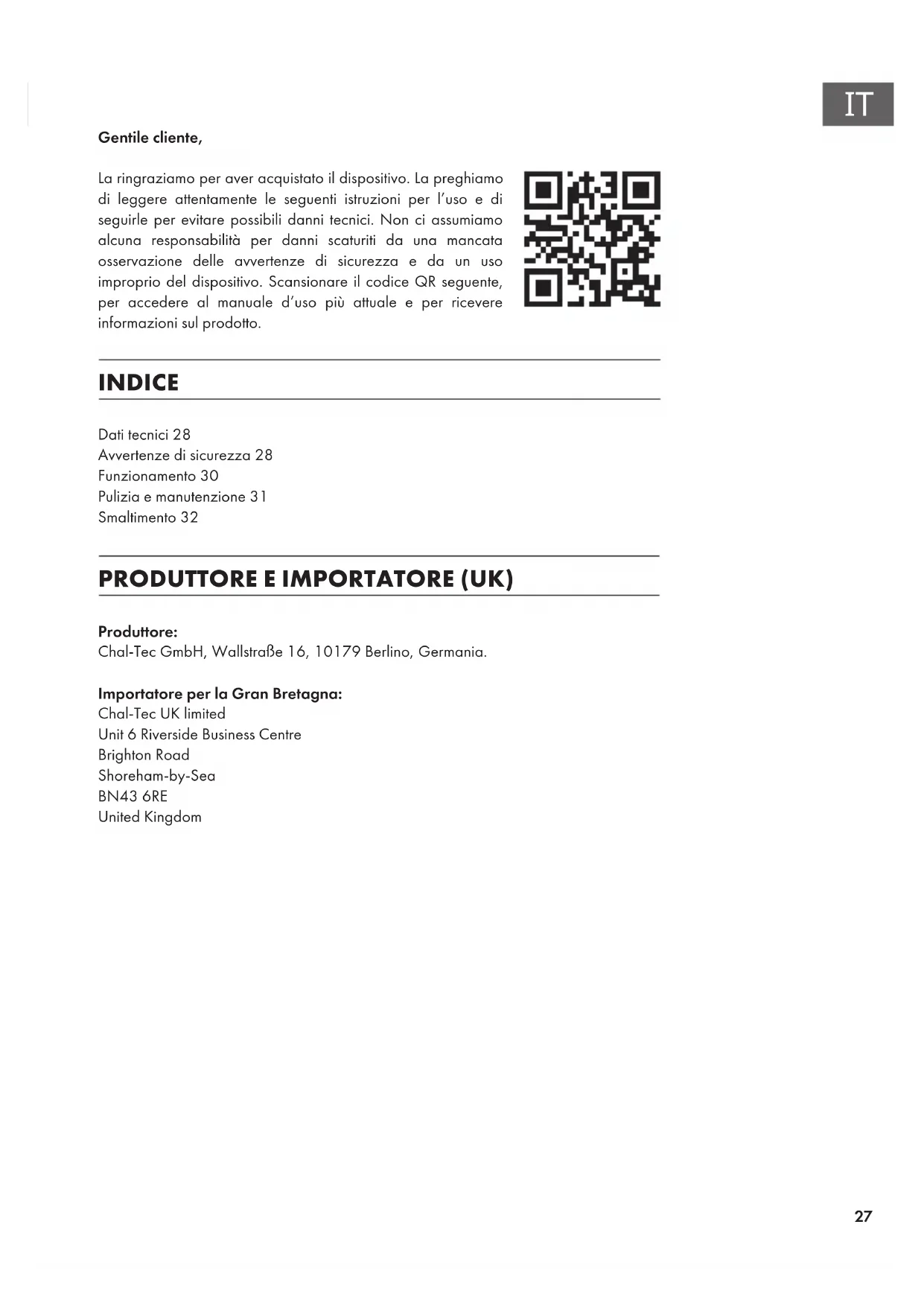 Gentile cliente, La ringraziamo per aver acquistato il dispositivo. La preghiamo di leggere attentamente le seguenti istruzioni per l’uso e di seguirle per evitare possibili danni tecnici. Non ci assumiamo alcuna responsabilità per danni scaturiti da una mancata osservazione delle avvertenze di sicurezza e da un uso improprio del dispositivo. Scansionare il codice QR seguente, per accedere al manuale d’uso più attuale e per ricevere informazioni sul prodotto. INDICE PRODUTTORE E IMPORTATORE (UK) Produttore: Chal-Tec GmbH, Wallstraße 16, 10179 Berlino, Germania. Importatore per la Gran Bretagna: Chal-Tec UK limited Unit 6 Riverside Business Centre Brighton Road Shoreham-by-Sea BN43 6RE United Kingdom Dati tecnici28 Avvertenze di sicurezza28 Funzionamento30 Pulizia e manutenzione31 Smaltimento3228