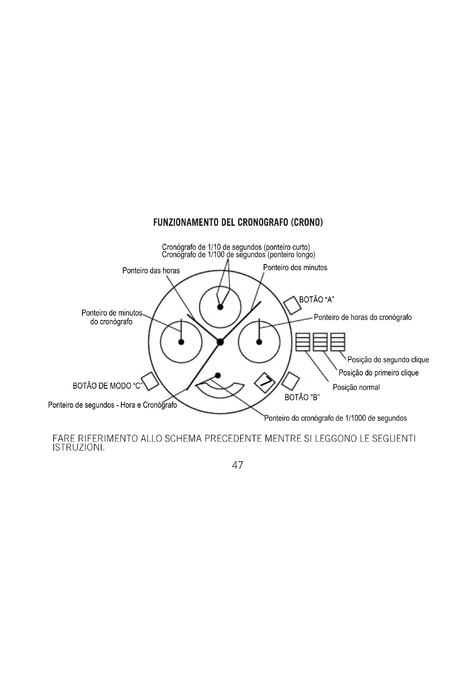 Qualora non lo fossero, andare direttamente alla sezione “E” di seguito per reimpostare correttamente le lancette, quindi tornare a queste istruzioni. Se invece le lancette sono nella posizione corretta, usare il cronografo come descritto di seguito.