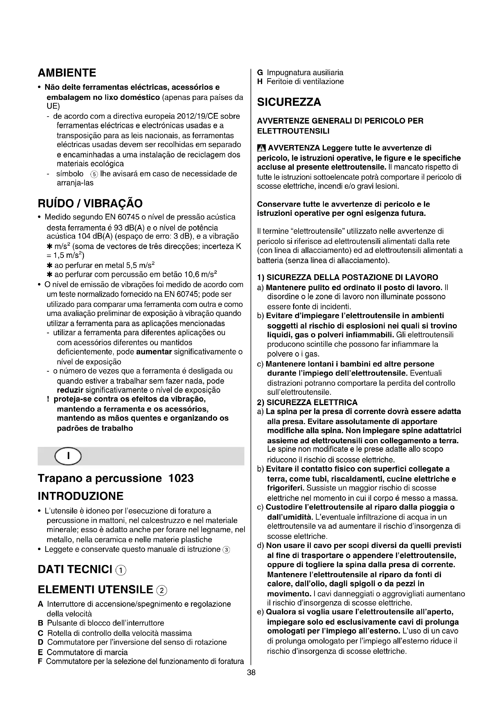 - Leggete e conservate questo manuale di istruzione 3 DATI TECNICI 1 ELEMENTI UTENSILE 2 A Interruttore di accensione/spegnimento e regolazione della velocità B Pulsante di blocco dell’interruttore C Rotella di controllo della velocità massima D Commutatore per l’inversione del senso di rotazione E Commutatore di marcia F Commutatore per la selezione del funzionamento di foratura G Impugnatura ausiliaria H Feritoie di ventilazione SICUREZZA