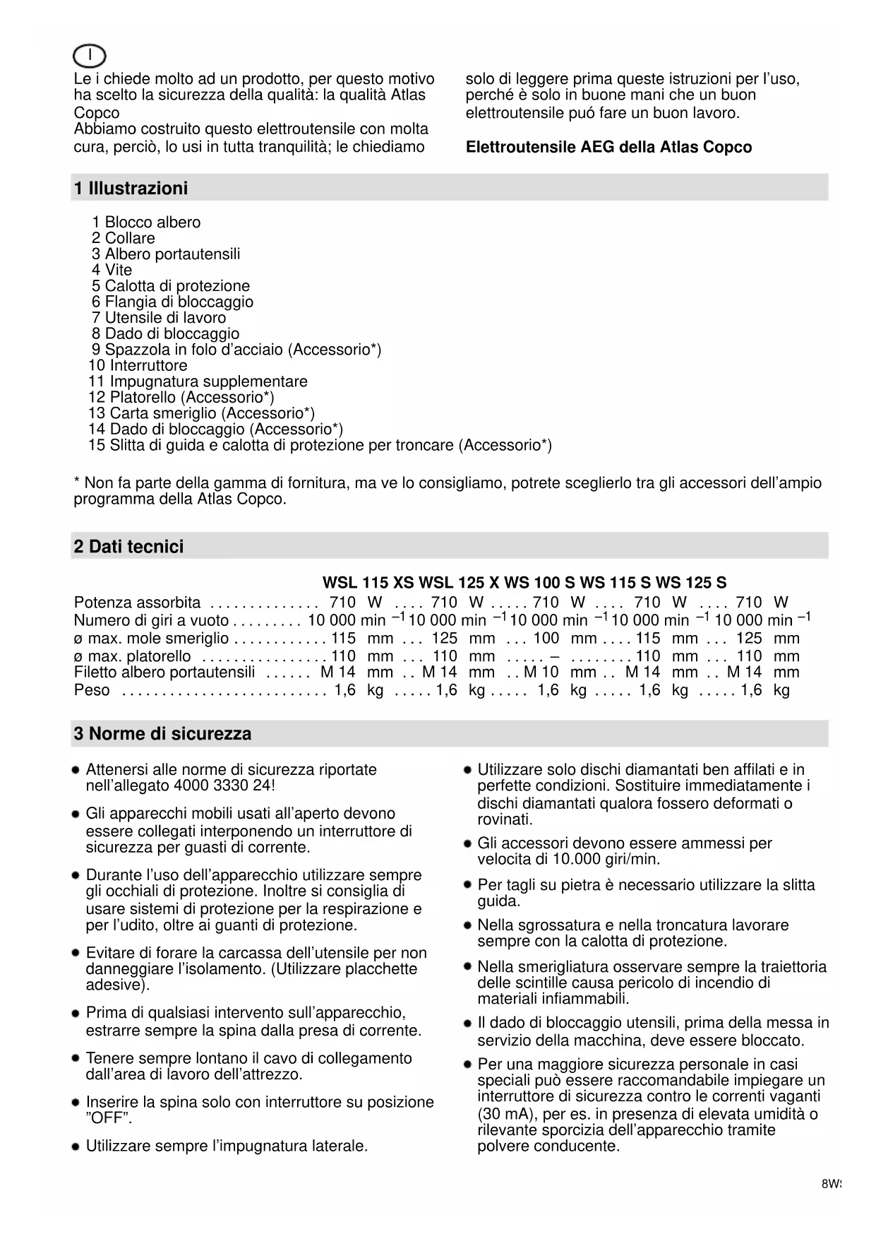 - Non fa parte della gamma di fornitura, ma ve lo consigliamo, potrete sceglierlo tra gli accessori dell’ampio programma della Atlas Copco. 2 Dati tecnici WSL 115 XS WSL 125 X WS 100 S WS 115 S WS 125 S Potenza assorbita 710 W 710 W 710 W 710 W 710 W. . . . . . . . . . . . . . . . . . . . . . . . . . . . . . . Numero di giri a vuoto 10 000 min