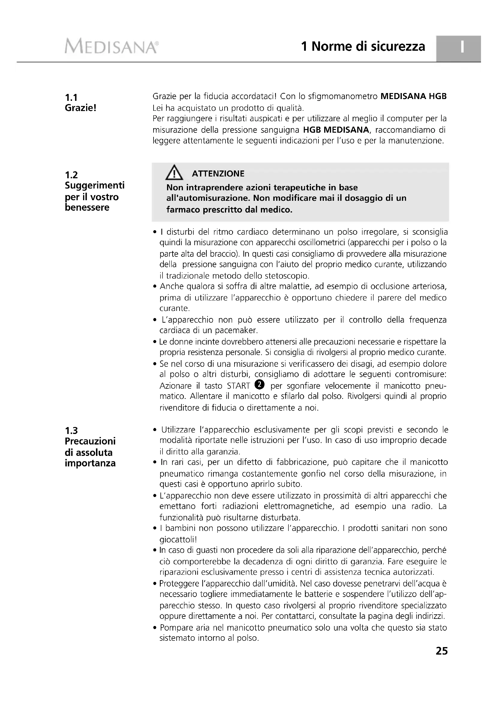 - 1 Opuscolo d’istruzioni per l’uso • 1 Custodia Le confezioni sono riutilizzabili o possono essere riciclate. Smaltire il materiale d’imballaggio non più necessario in conformità alle disposizioni vigenti. In caso di danneggiamenti dovuti al trasporto, mettersi immediatamente in contatto con il proprio rivenditore. ATTENZIONE Assicurarsi che i sacchetti d’imballaggio non siano alla portata dei bambini. Pericolo di soffocamento! La pressione sanguigna è la pressione presente nei vasi sanguigni a ogni battito cardiaco. Quando il cuore si contrae (= sistole) e pompa il sangue nelle arterie, si ha un innalzamento di pressione, il cui valore massimo è definito pressione sistolica ed è il primo ad essere rilevato nel corso della misurazione della pressione sanguigna. Quando il muscolo cardiaco si allenta per ricevere nuovo sangue, scende anche la pressione nelle arterie. Ed è proprio nel momento in cui i vasi sanguigni sono rilassati che si misura il secondo valore, ovvero la pressione diastolica. HGB è uno sfigmomanometro destinato alla misurazione della pressione arte- riosa sul polso. La misurazione avviene tramite un microprocessore che grazie ad un sensore di pressione è in grado di valutare le oscillazioni che si verifica- no nelle arterie e che vengono rilevate gonfiando e sgonfiando il manicotto pneumatico. MEDISANA vanta un’esperienza pluriennale nel campo della misurazione della pressione sanguigna. L’elevata precisione del principio di misurazione degli apparecchi MEDISANA è provata da numerosi studi clinici, condotti sulla base di severi standard internazionali. Un valido argomento a favore della misurazione della pressione sanguigna a casa propria è dato dal fatto che le misurazioni sono effettuate in un ambiente familiare e in condizioni di relax. Particolarmente importante è il cosiddetto “valore base”, cioè quello rilevato al mattino appena svegli, prima della colazione. Sarebbe fondamentale misurare la propria pressione sanguigna possibilmente sempre alla stessa ora e nelle stesse condizioni. Ciò, infatti, consentirebbe di confrontare i risultati e di riconoscere per tempo i disturbi iniziali dell’alta pressione. Se per molto tempo non ci si accorge di soffrire di alta pressione, aumenta il rischio di ulteriori malattie cardiovascolari. IL NOSTRO CONSIGLIO: Consigliamo dunque di misurare la pressione sanguigna quotidianamente e con regolarità, anche nel caso in cui non siano presenti particolari disturbi.