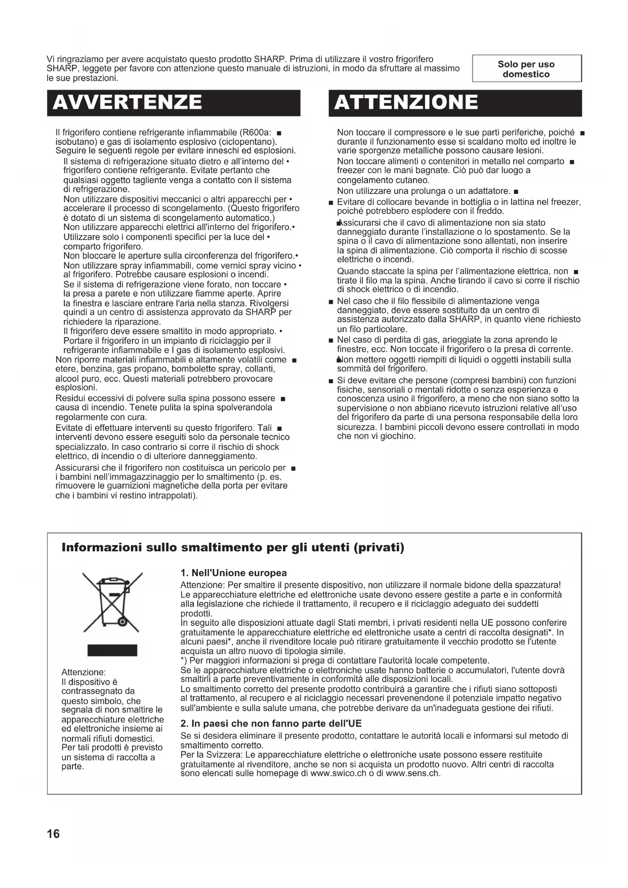(B246)-W.indb 15 2011/08/30 22:05:2316 Solo per uso domestico Vi ringraziamo per avere acquistato questo prodotto SHARP. Prima di utilizzare il vostro frigorifero SHARP, leggete per favore con attenzione questo manuale di istruzioni, in modo da sfruttare al massimo le sue prestazioni. Il frigorifero contiene refrigerante inammabile (R600a: ■ isobutano) e gas di isolamento esplosivo (ciclopentano). Seguire le seguenti regole per evitare inneschi ed esplosioni. Il sistema di refrigerazione situato dietro e all’interno del • frigorifero contiene refrigerante. Evitate pertanto che qualsiasi oggetto tagliente venga a contatto con il sistema di refrigerazione. Non utilizzare dispositivi meccanici o altri apparecchi per • accelerare il processo di scongelamento. (Questo frigorifero è dotato di un sistema di scongelamento automatico.) Non utilizzare apparecchi elettrici all'interno del frigorifero.• Utilizzare solo i componenti specici per la luce del • comparto frigorifero. Non bloccare le aperture sulla circonferenza del frigorifero.• Non utilizzare spray inammabili, come vernici spray vicino • al frigorifero. Potrebbe causare esplosioni o incendi. Se il sistema di refrigerazione viene forato, non toccare • la presa a parete e non utilizzare amme aperte. Aprire la nestra e lasciare entrare l'aria nella stanza. Rivolgersi quindi a un centro di assistenza approvato da SHARP per richiedere la riparazione. Il frigorifero deve essere smaltito in modo appropriato. • Portare il frigorifero in un impianto di riciclaggio per il refrigerante inammabile e I gas di isolamento esplosivi. Non riporre materiali inammabili e altamente volatili come ■ etere, benzina, gas propano, bombolette spray, collanti, alcool puro, ecc. Questi materiali potrebbero provocare esplosioni. Residui eccessivi di polvere sulla spina possono essere ■ causa di incendio. Tenete pulita la spina spolverandola regolarmente con cura. Evitate di effettuare interventi su questo frigorifero. Tali ■ interventi devono essere eseguiti solo da personale tecnico specializzato. In caso contrario si corre il rischio di shock elettrico, di incendio o di ulteriore danneggiamento. Assicurarsi che il frigorifero non costituisca un pericolo per ■ i bambini nell’immagazzinaggio per lo smaltimento (p. es. rimuovere le guarnizioni magnetiche della porta per evitare che i bambini vi restino intrappolati). AVVERTENZE ATTENZIONE Non toccare il compressore e le sue parti periferiche, poiché ■ durante il funzionamento esse si scaldano molto ed inoltre le varie sporgenze metalliche possono causare lesioni. Non toccare alimenti o contenitori in metallo nel comparto ■ freezer con le mani bagnate. Ciò può dar luogo a congelamento cutaneo. Non utilizzare una prolunga o un adattatore. ■ Evitare di collocare bevande in bottiglia o in lattina nel freezer, ■ poiché potrebbero esplodere con il freddo. Assicurarsi che il cavo di alimentazione non sia stato ■ danneggiato durante l’installazione o lo spostamento. Se la spina o il cavo di alimentazione sono allentati, non inserire la spina di alimentazione. Ciò comporta il rischio di scosse elettriche o incendi. Quando staccate la spina per l’alimentazione elettrica, non ■ tirate il lo ma la spina. Anche tirando il cavo si corre il rischio di shock elettrico o di incendio. Nel caso che il lo essibile di alimentazione venga ■ danneggiato, deve essere sostituito da un centro di assistenza autorizzato dalla SHARP, in quanto viene richiesto un lo particolare. Nel caso di perdita di gas, arieggiate la zona aprendo le ■ nestre, ecc. Non toccate il frigorifero o la presa di corrente. Non mettere oggetti riempiti di liquidi o oggetti instabili sulla ■ sommità del frigorifero. Si deve evitare che persone (compresi bambini) con funzioni ■ siche, sensoriali o mentali ridotte o senza esperienza e conoscenza usino il frigorifero, a meno che non siano sotto la supervisione o non abbiano ricevuto istruzioni relative all’uso del frigorifero da parte di una persona responsabile della loro sicurezza. I bambini piccoli devono essere controllati in modo che non vi giochino. Informazioni sullo smaltimento per gli utenti (privati)