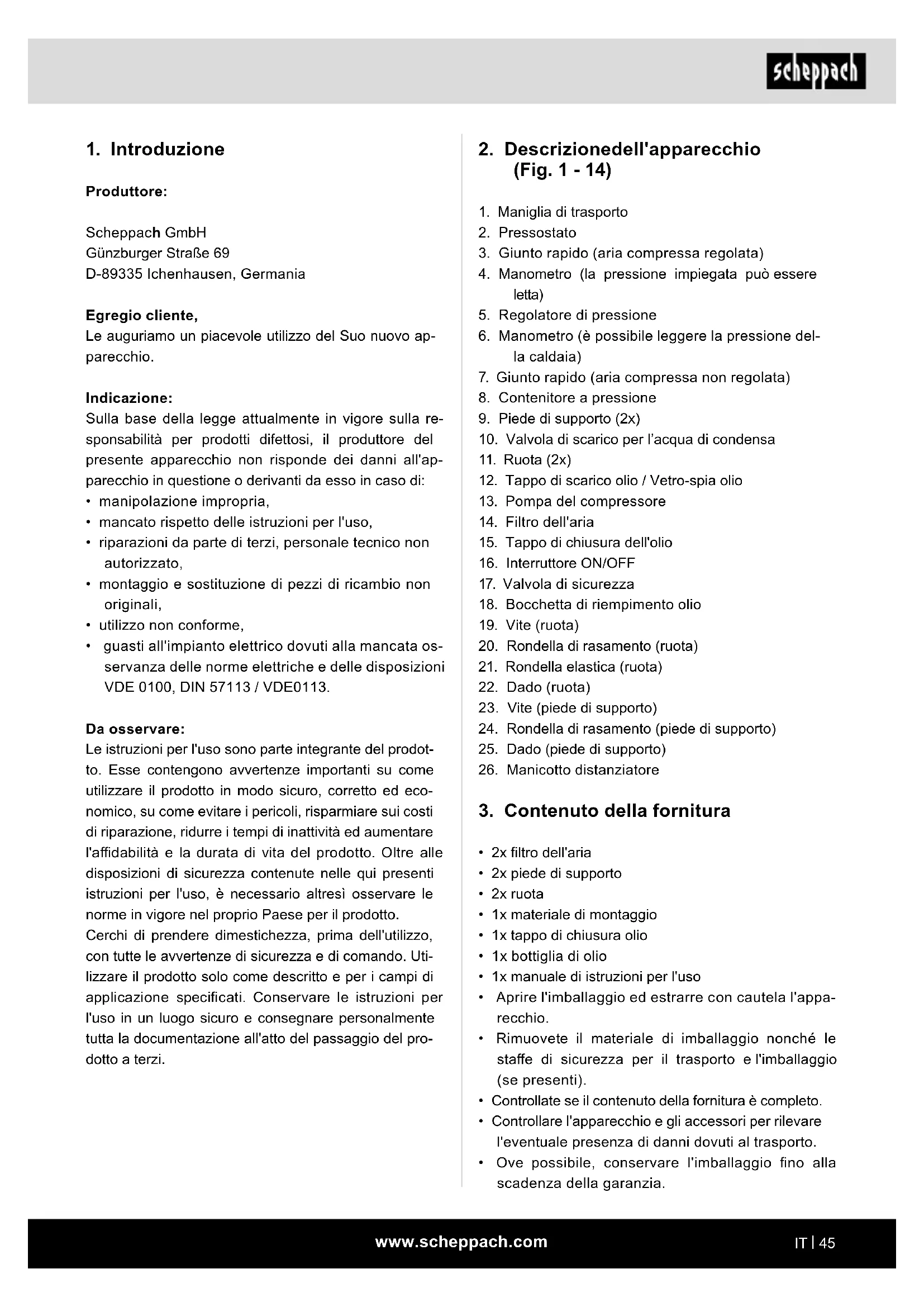 Produttore: Scheppach GmbH Günzburger Straße 69 D-89335 Ichenhausen, Germania Egregio cliente, Le auguriamo un piacevole utilizzo del Suo nuovo ap- parecchio. Indicazione: Sulla base della legge attualmente in vigore sulla re- sponsabilità per prodotti difettosi, il produttore del presente apparecchio non risponde dei danni all'ap- parecchio in questione o derivanti da esso in caso di: