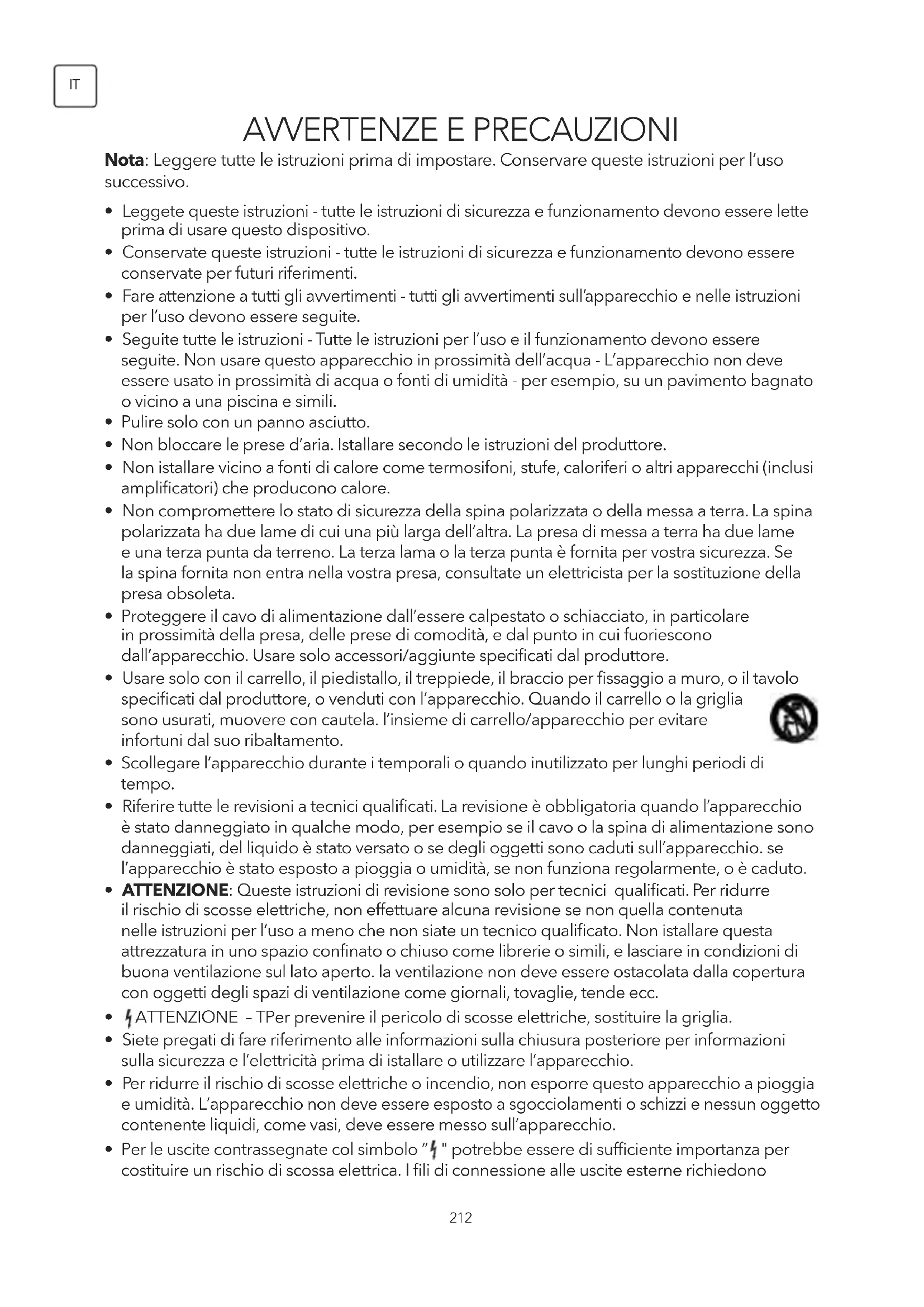 Questa spia luminosa con il simbolo di una punta di freccia all’interno del triangolo equilatero indica all’utente la presenza di un “voltaggio pericolo” non-isolato all’interno del dispositivo che può essere di sufficiente importanza per costituire un rischio di scossa elettrica. Per ridurre il rischio di scossa elettrica. Non rimuovere il coperchio (o il retro). Non ci sono parti utilizzabili dall’utente all’interno. Contattare un tecnico qualificato. Il punto esclamativo all’interno del triangolo equilatero indica all’utente la presenza di istruzioni importanti per l’uso e il mantenimento nel libretto che accompagna il dispositivo.215