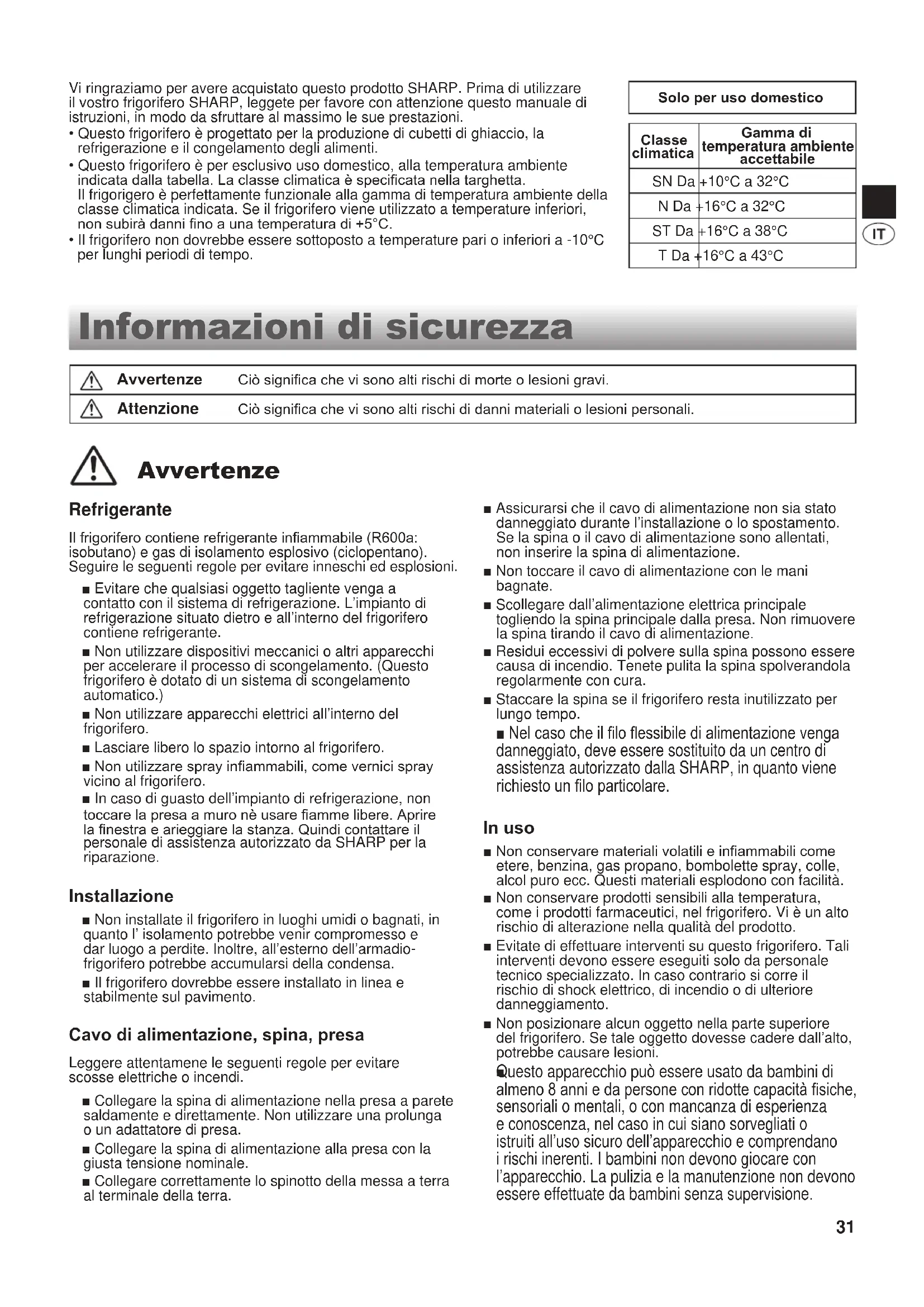 - Il frigorifero non dovrebbe essere sottoposto a temperature pari o inferiori a -10°C per lunghi periodi di tempo. Refrigerante Ilfrigoriferocontienerefrigeranteinammabile(R600a: isobutano) e gas di isolamento esplosivo (ciclopentano). Seguire le seguenti regole per evitare inneschi ed esplosioni. ■ Evitare che qualsiasi oggetto tagliente venga a contatto con il sistema di refrigerazione. L’impianto di refrigerazione situato dietro e all’interno del frigorifero contiene refrigerante. ■ Non utilizzare dispositivi meccanici o altri apparecchi per accelerare il processo di scongelamento. (Questo frigorifero è dotato di un sistema di scongelamento automatico.) ■ Non utilizzare apparecchi elettrici all’interno del frigorifero. ■ Lasciare libero lo spazio intorno al frigorifero. ■ Nonutilizzaresprayinammabili,comevernicispray vicino al frigorifero. ■ In caso di guasto dell’impianto di refrigerazione, non toccarelapresaamuronèusareammelibere.Aprire lanestraearieggiarelastanza.Quindicontattareil personale di assistenza autorizzato da SHARP per la riparazione. Installazione ■ Non installate il frigorifero in luoghi umidi o bagnati, in quanto l’ isolamento potrebbe venir compromesso e dar luogo a perdite. Inoltre, all’esterno dell’armadio- frigorifero potrebbe accumularsi della condensa. ■ Il frigorifero dovrebbe essere installato in linea e stabilmente sul pavimento. Cavo di alimentazione, spina, presa Leggere attentamene le seguenti regole per evitare scosse elettriche o incendi. ■ Collegare la spina di alimentazione nella presa a parete saldamente e direttamente. Non utilizzare una prolunga o un adattatore di presa. ■ Collegare la spina di alimentazione alla presa con la giusta tensione nominale. ■ Collegare correttamente lo spinotto della messa a terra al terminale della terra. ■ Assicurarsi che il cavo di alimentazione non sia stato danneggiato durante l’installazione o lo spostamento. Se la spina o il cavo di alimentazione sono allentati, non inserire la spina di alimentazione. ■ Non toccare il cavo di alimentazione con le mani bagnate. ■ Scollegare dall’alimentazione elettrica principale togliendo la spina principale dalla presa. Non rimuovere la spina tirando il cavo di alimentazione. ■ Residui eccessivi di polvere sulla spina possono essere causa di incendio. Tenete pulita la spina spolverandola regolarmente con cura. ■ Staccare la spina se il frigorifero resta inutilizzato per lungo tempo. ■ Nelcasocheilloessibiledialimentazionevenga danneggiato, deve essere sostituito da un centro di assistenza autorizzato dalla SHARP, in quanto viene richiestounloparticolare. In uso ■ Nonconservarematerialivolatilieinammabilicome etere, benzina, gas propano, bombolette spray, colle, alcol puro ecc. Questi materiali esplodono con facilità. ■ Non conservare prodotti sensibili alla temperatura, come i prodotti farmaceutici, nel frigorifero. Vi è un alto rischio di alterazione nella qualità del prodotto. ■ Evitate di effettuare interventi su questo frigorifero. Tali interventi devono essere eseguiti solo da personale tecnico specializzato. In caso contrario si corre il rischio di shock elettrico, di incendio o di ulteriore danneggiamento. ■ Non posizionare alcun oggetto nella parte superiore del frigorifero. Se tale oggetto dovesse cadere dall’alto, potrebbe causare lesioni.