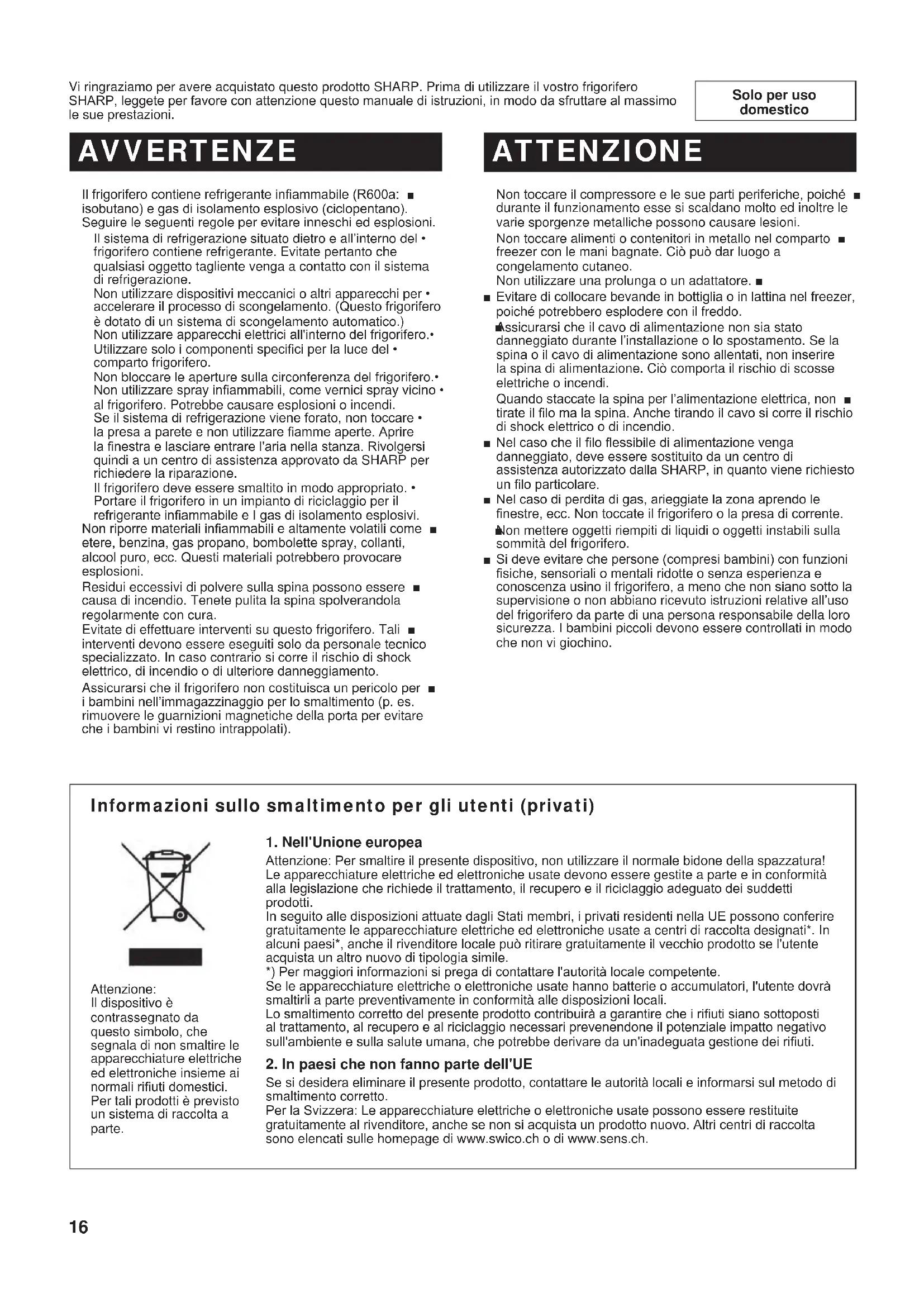 (B246)-W.indb 15 2011/08/30 22:05:2316 Solo per uso domestico Vi ringraziamo per avere acquistato questo prodotto SHARP. Prima di utilizzare il vostro frigorifero SHARP, leggete per favore con attenzione questo manuale di istruzioni, in modo da sfruttare al massimo le sue prestazioni. Il frigorifero contiene refrigerante inammabile (R600a: ■ isobutano) e gas di isolamento esplosivo (ciclopentano). Seguire le seguenti regole per evitare inneschi ed esplosioni. Il sistema di refrigerazione situato dietro e all’interno del • frigorifero contiene refrigerante. Evitate pertanto che qualsiasi oggetto tagliente venga a contatto con il sistema di refrigerazione. Non utilizzare dispositivi meccanici o altri apparecchi per • accelerare il processo di scongelamento. (Questo frigorifero è dotato di un sistema di scongelamento automatico.) Non utilizzare apparecchi elettrici all'interno del frigorifero.• Utilizzare solo i componenti specici per la luce del • comparto frigorifero. Non bloccare le aperture sulla circonferenza del frigorifero.• Non utilizzare spray inammabili, come vernici spray vicino • al frigorifero. Potrebbe causare esplosioni o incendi. Se il sistema di refrigerazione viene forato, non toccare • la presa a parete e non utilizzare amme aperte. Aprire la nestra e lasciare entrare l'aria nella stanza. Rivolgersi quindi a un centro di assistenza approvato da SHARP per richiedere la riparazione. Il frigorifero deve essere smaltito in modo appropriato. • Portare il frigorifero in un impianto di riciclaggio per il refrigerante inammabile e I gas di isolamento esplosivi. Non riporre materiali inammabili e altamente volatili come ■ etere, benzina, gas propano, bombolette spray, collanti, alcool puro, ecc. Questi materiali potrebbero provocare esplosioni. Residui eccessivi di polvere sulla spina possono essere ■ causa di incendio. Tenete pulita la spina spolverandola regolarmente con cura. Evitate di effettuare interventi su questo frigorifero. Tali ■ interventi devono essere eseguiti solo da personale tecnico specializzato. In caso contrario si corre il rischio di shock elettrico, di incendio o di ulteriore danneggiamento. Assicurarsi che il frigorifero non costituisca un pericolo per ■ i bambini nell’immagazzinaggio per lo smaltimento (p. es. rimuovere le guarnizioni magnetiche della porta per evitare che i bambini vi restino intrappolati). AVVERTENZE ATTENZIONE Non toccare il compressore e le sue parti periferiche, poiché ■ durante il funzionamento esse si scaldano molto ed inoltre le varie sporgenze metalliche possono causare lesioni. Non toccare alimenti o contenitori in metallo nel comparto ■ freezer con le mani bagnate. Ciò può dar luogo a congelamento cutaneo. Non utilizzare una prolunga o un adattatore. ■ Evitare di collocare bevande in bottiglia o in lattina nel freezer, ■ poiché potrebbero esplodere con il freddo. Assicurarsi che il cavo di alimentazione non sia stato ■ danneggiato durante l’installazione o lo spostamento. Se la spina o il cavo di alimentazione sono allentati, non inserire la spina di alimentazione. Ciò comporta il rischio di scosse elettriche o incendi. Quando staccate la spina per l’alimentazione elettrica, non ■ tirate il lo ma la spina. Anche tirando il cavo si corre il rischio di shock elettrico o di incendio. Nel caso che il lo essibile di alimentazione venga ■ danneggiato, deve essere sostituito da un centro di assistenza autorizzato dalla SHARP, in quanto viene richiesto un lo particolare. Nel caso di perdita di gas, arieggiate la zona aprendo le ■ nestre, ecc. Non toccate il frigorifero o la presa di corrente. Non mettere oggetti riempiti di liquidi o oggetti instabili sulla ■ sommità del frigorifero. Si deve evitare che persone (compresi bambini) con funzioni ■ siche, sensoriali o mentali ridotte o senza esperienza e conoscenza usino il frigorifero, a meno che non siano sotto la supervisione o non abbiano ricevuto istruzioni relative all’uso del frigorifero da parte di una persona responsabile della loro sicurezza. I bambini piccoli devono essere controllati in modo che non vi giochino. Informazioni sullo smaltimento per gli utenti (privati)