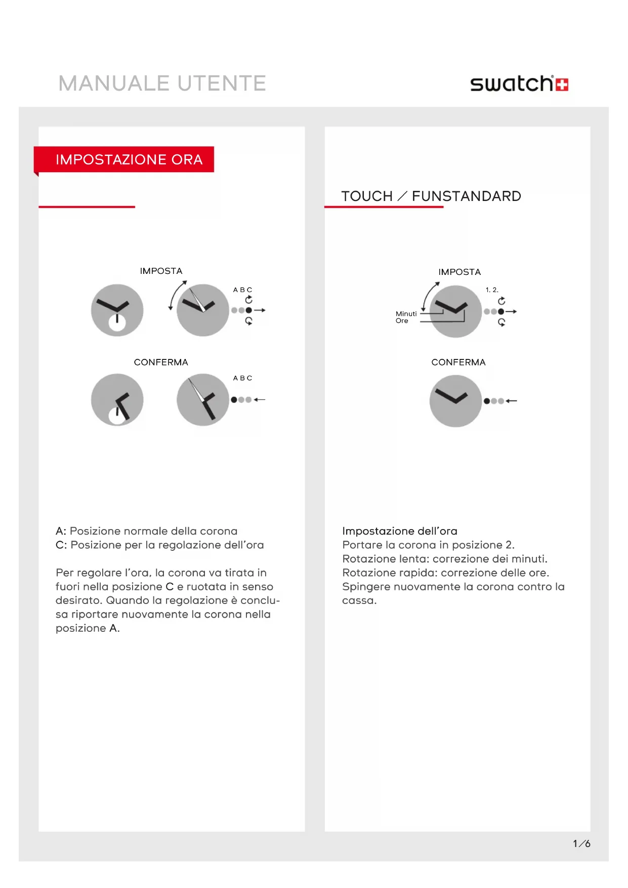 Attivazione/disattivazione del modo Sveglia, impostazione dell’ora per la sveglia Premere brevemente sulla corona e le lancette indicano il modo attuale „on“ oppure „o“. Premere nuovamente la corona, per cambiare il modo impostato.MANUALE UTENTE 5/6 ~4 sec. TOUCH GAME Toccate il vostro Swatch. Le due lancette si posizionano sulle ore 12:00 e compiono almeno un giro completo. IMPORTANTE: Se le lancette non si posizionano esattamente sulle ore 12:00, è necessario regolarle manualmente. Le lancette si fermano a caso ed indicano per alcuni secondi il risultato del gioco… ...e poi ritornano ad indicare l’ora attuale. IMPORTANTE: Se le lancette non indicano correttamente ON-OFF (modo Sveglia), in tal caso è necessario regolare nuovamente il Touch Alarm (per es. dopo aver sostituito la pila o in seguito ad un urto violento). DEMO SVEGLIA2 sec. Per avviare la dimostrazione per la sveglia, mantenere premuta la corona per 2 sec. Per fermare la dimostrazione, premere nuo- vamente la corona. Portare la corona in posizione 1 e le lancette si portano automaticamente sull’ultima ora impostata per la sveglia. Per cambiare l’impostazione, ruotare la corona (rotazione lenta per i minuti e rotazione rapida per le ore). Quando la corona viene riposizionata contro la cassa, le lancette si riposizionano sull’ora attuale e il modo Sveglia è su „on“.MANUALE UTENTE 6/6 IMPOSTALEGGI FUNZIONE SCUBA: TEMPO TRASCORSO Uso della ghiera girevole Serve per indicare inizio e durata di un’attività. All’ inizio dell’attività, porre il contrassegno della ghiera girevole esattamente di fronte alla lancetta dei minuti. La durata dell’attività si calcola a partire dal contrassegno no al punto indicato dalla lancetta al termine dell’attività. Il tempo trascorso è indicato dalla lancetta dei minuti che punta il numero sulla ghiera girevole. IMPORTANTE: Dopo un’immersione in mare, risciacquare lo Scuba 200 Chrono con acqua dolce. ATTENZIONE: L’Irony Scuba 200 Chrono non è un orologio professionale da immer- sione.