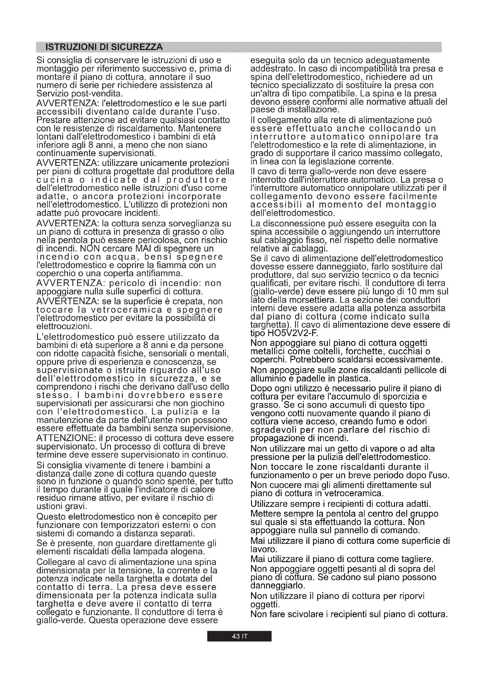 - - 1 8,7 kW (NG) 8,3 kW (LPG) 829 l/h 604 g/h 7,2 kW 686 l/h 524 g/h 9,45 kW 900 l/h 688 g/h 9,65 kW 920 l/h 702 g/h 10,45 kW 10,05 kW 996 l/h 731 g/h43 IT Si consiglia di conservare le istruzioni di uso e montaggio per riferimento successivo e, prima di montare il piano di cottura, annotare il suo numero di serie per richiedere assistenza al Servizio post-vendita. AVVERTENZA: l'elettrodomestico e le sue parti accessibili diventano calde durante l'uso. Prestare attenzione ad evitare qualsiasi contatto con le resistenze di riscaldamento. Mantenere lontani dall'elettrodomestico i bambini di età inferiore agli 8 anni, a meno che non siano continuamente supervisionati. AVVERTENZA: utilizzare unicamente protezioni per piani di cottura progettate dal produttore della cucina o indicate dal produttore dell'elettrodomestico nelle istruzioni d'uso come adatte, o ancora protezioni incorporate nell'elettrodomestico. L'utilizzo di protezioni non adatte può provocare incidenti. AVVERTENZA: la cottura senza sorveglianza su un piano di cottura in presenza di grasso o olio nella pentola può essere pericolosa, con rischio di incendi. NON cercare MAI di spegnere un incendio con acqua, bensì spegnere l'elettrodomestico e coprire la fiamma con un coperchio o una coperta antifiamma. AVVERTENZA: pericolo di incendio: non appoggiare nulla sulle superfici di cottura. AVVERTENZA: se la superficie è crepata, non toccare la vetroceramica e spegnere l'elettrodomestico per evitare la possibilità di elettrocuzioni. L'elettrodomestico può essere utilizzato da bambini di età superiore a 8 anni e da persone con ridotte capacità fisiche, sensoriali o mentali, oppure prive di esperienza e conoscenza, se supervisionate o istruite riguardo all'uso dell'elettrodomestico in sicurezza, e se comprendono i rischi che derivano dall'uso dello stesso. I bambini dovrebbero essere supervisionati per assicurarsi che non giochino con l'elettrodomestico. La pulizia e la manutenzione da parte dell'utente non possono essere effettuate da bambini senza supervisione. ATTENZIONE: il processo di cottura deve essere supervisionato. Un processo di cottura di breve termine deve essere supervisionato in continuo. Si consiglia vivamente di tenere i bambini a distanza dalle zone di cottura quando queste sono in funzione o quando sono spente, per tutto il tempo durante il quale l'indicatore di calore residuo rimane attivo, per evitare il rischio di ustioni gravi. Questo elettrodomestico non è concepito per funzionare con temporizzatori esterni o con sistemi di comando a distanza separati. Se è presente, non guardare direttamente gli elementi riscaldati della lampada alogena. Collegare al cavo di alimentazione una spina dimensionata per la tensione, la corrente e la potenza indicate nella targhetta e dotata del contatto di terra. La presa deve essere dimensionata per la potenza indicata sulla targhetta e deve avere il contatto di terra collegato e funzionante. Il conduttore di terra è giallo-verde. Questa operazione deve essere