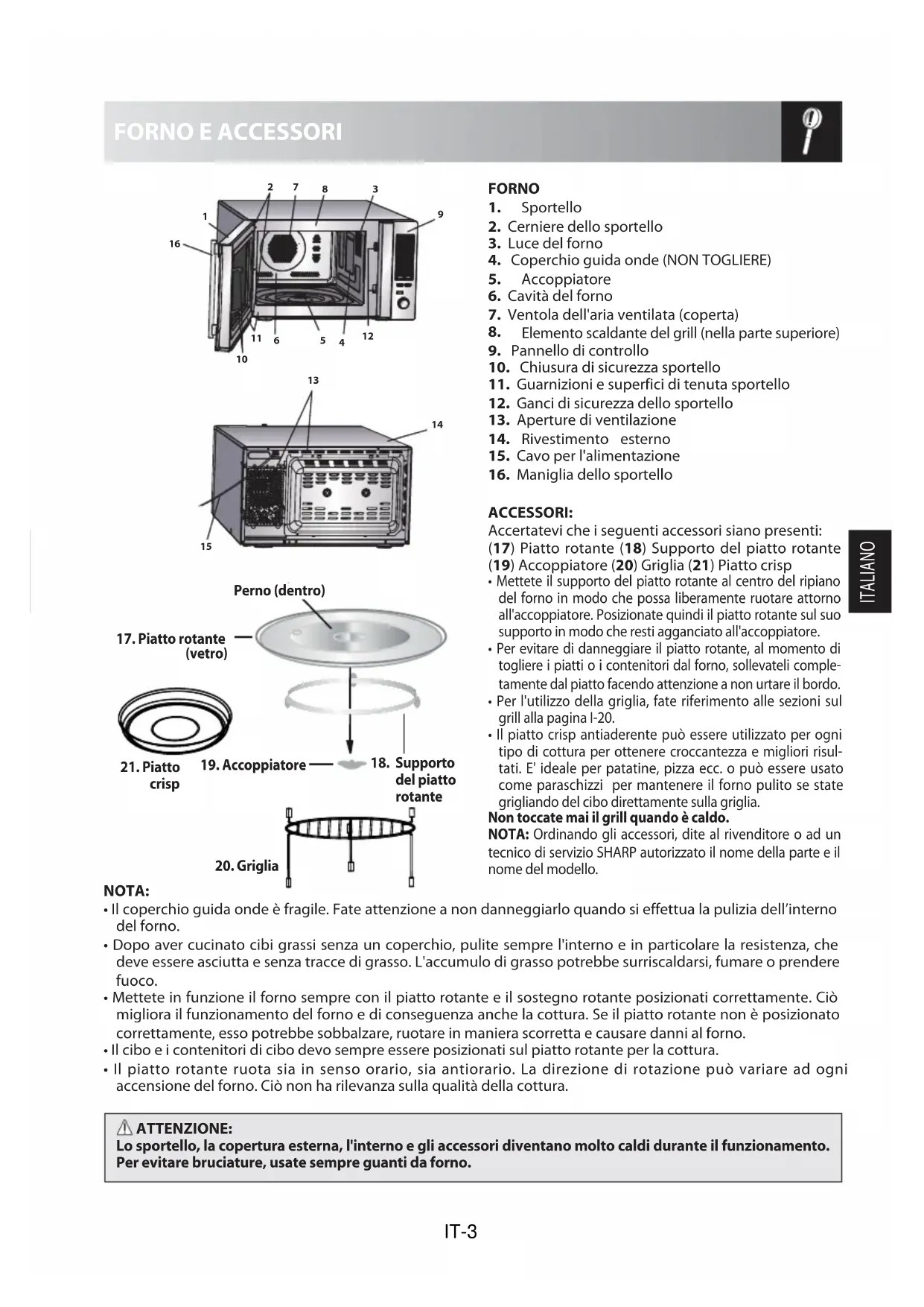 - Il piatto rotante ruota sia in senso orario, sia antiorario. La direzione di rotazione può variare ad ogni accensione del forno. Ciò non ha rilevanza sulla qualità della cottura. ATTENZIONE: Lo sportello, la copertura esterna, l'interno e gli accessori diventano molto caldi durante il funzionamento. Per evitare bruciature, usate sempre guanti da forno. FORNO