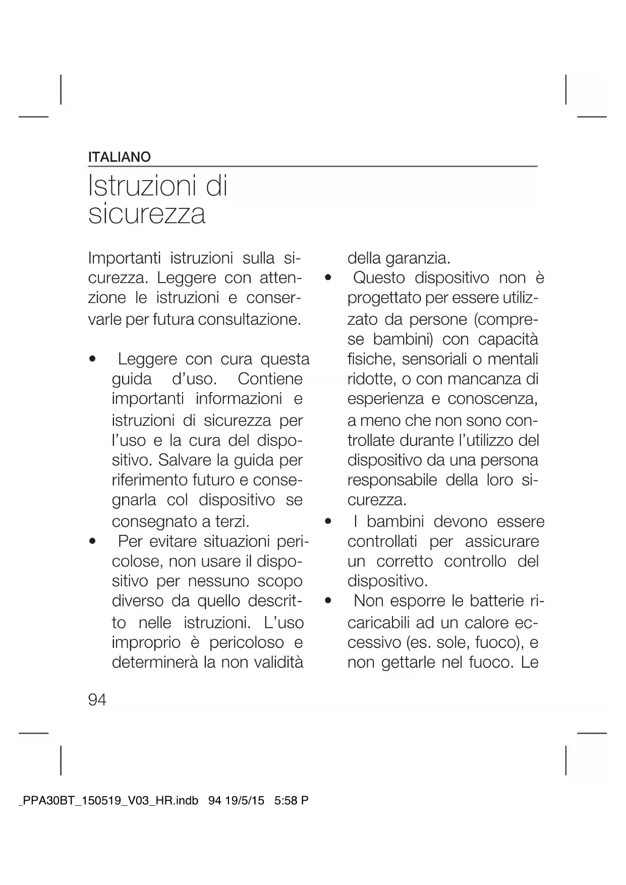 - Non esporre le batterie ri- caricabili ad un calore ec- cessivo (es. sole, fuoco), e non gettarle nel fuoco. Le IM_PPA30BT_150519_V03_HR.indb 94 19/5/15 5:58 PMITALIANO